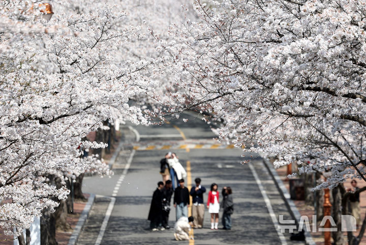 이무열 기자 = 포근한 봄 날씨를 보인 3일 대구 달서구 계명대학교 성서캠퍼스에서 학생들이 만개한 벚꽃 배경으로 사진을 찍고 있다.