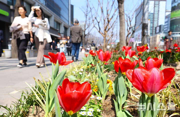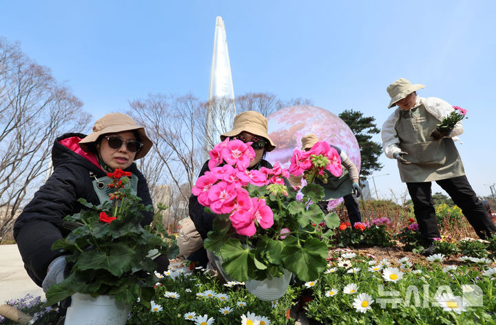 권창회 기자 = 24일 서울 송파구 석촌호수 더 스피어 인근에서 마을정원사들이 봄을 맞아 꽃을 심고 있다.