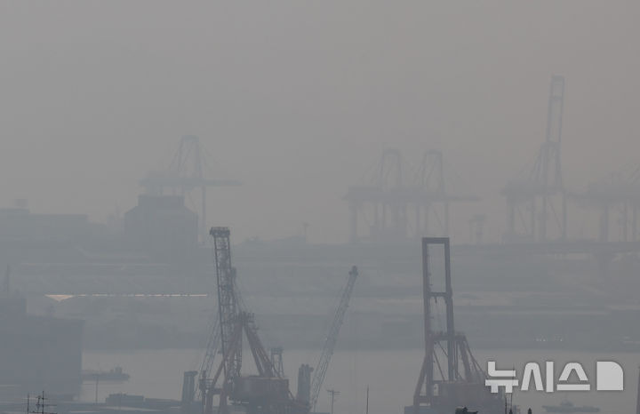 하경민 기자 = 부산 16개 구·군 전 지역에 '초미세먼지(PM-2.5) 주의보'가 발령된 24일 부산항 일대가 뿌옇게 보이고 있다.
