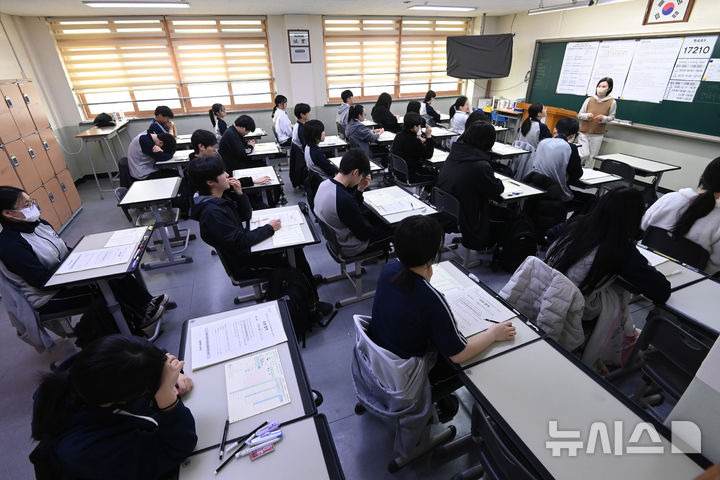 김종택 기자 = 올해 첫 전국연합학력평가가 실시된 24일 경기 수원시 효원고등학교 3학년 교실에서 학생들이 시험을 준비하고 있다