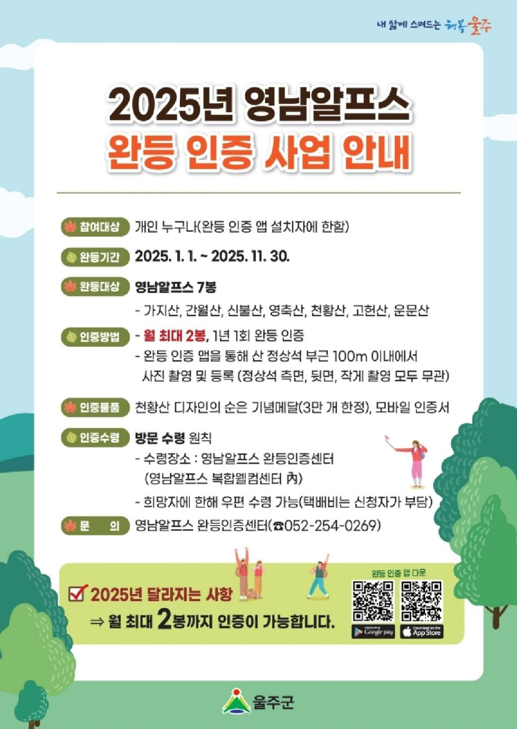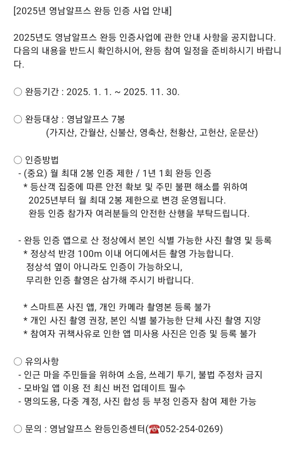 2025년 영남알프스 완등 인증 사업 안내(11/10 발표) 작성자동규/donggou|작성시간24.11.10|조회수654 목록 댓글 1 글자크기 작게가 글자크기 크게가 2025년 달라지는 사항 -->월 최대 2봉 인증 다음검색 현재 게시글 추가 기능 열기 북마크 공유하기 신고 센터로 신고 댓글 댓글 1 댓글쓰기 답글쓰기 댓글 리스트 작성자해나리 | 작성시간 24.11.11 그래서 1월9일 가지운문고헌을가지운문 당일산행으로 변경가능한가요?다른 일정도 대대적인 수정이 필요할거 같습니다만요~~ 댓글 전체보기