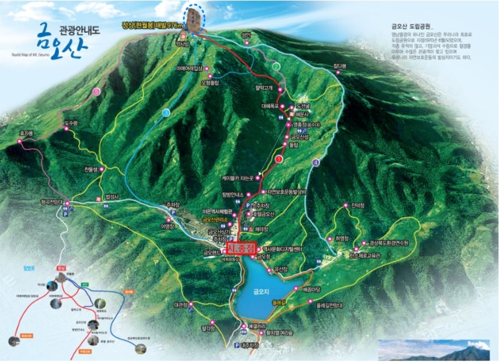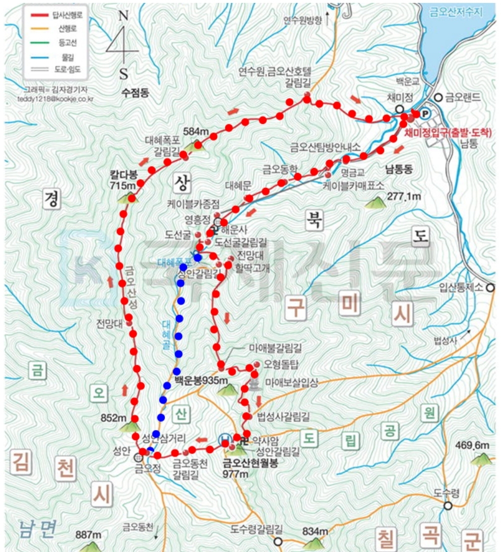 ㅇ B코스 : 금오산공영주차장-해운사-대혜폭포-오형돌탑-마애석불-약사암-금오산정상(인증)-성안-칼다봉-금오산공영주차장(약 10.4km/6시간)