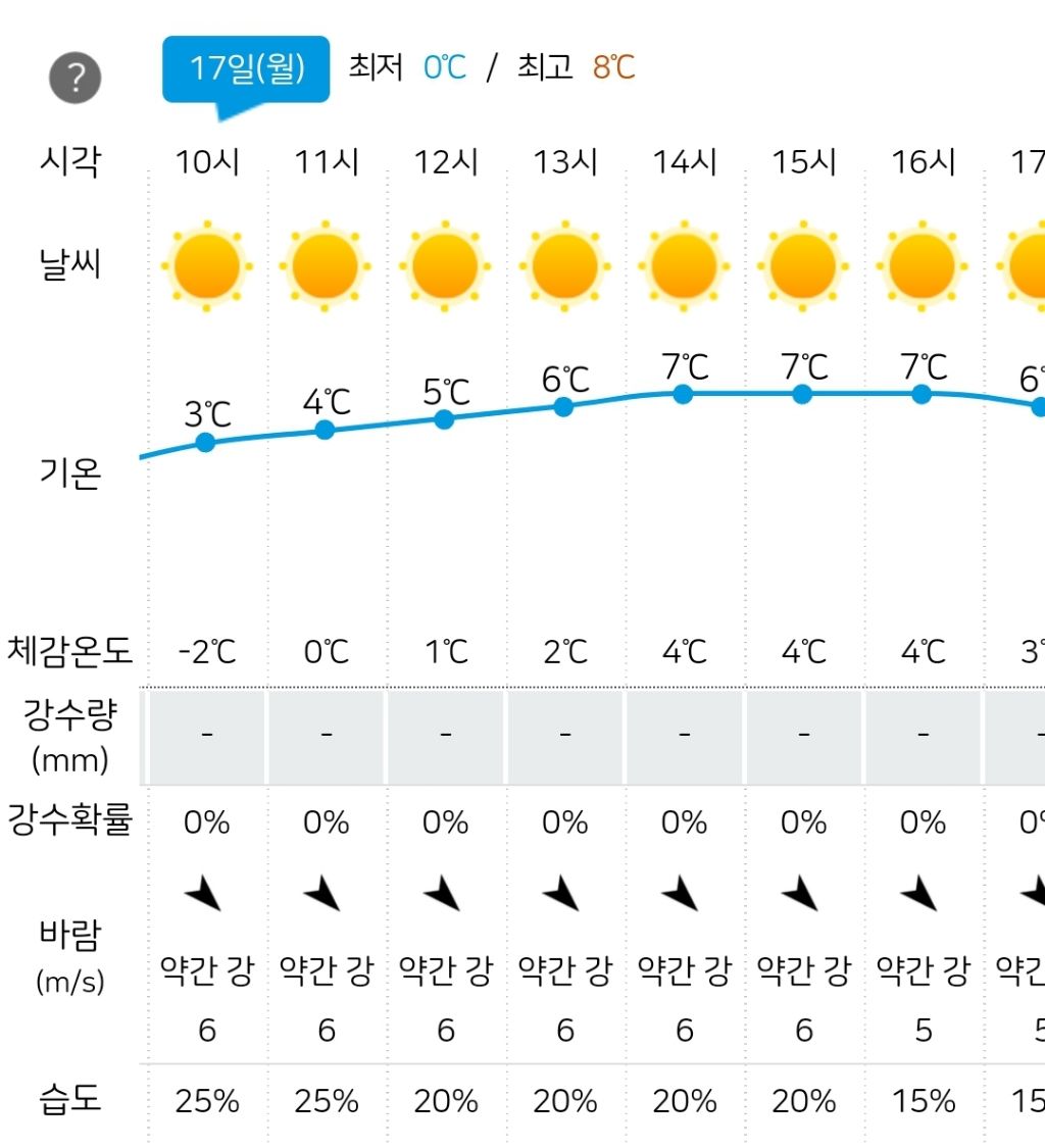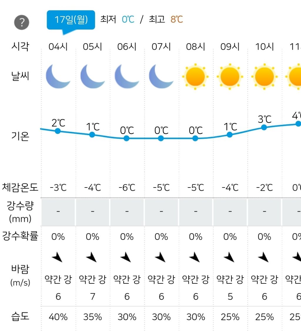 기온(0~7°C), 체감온도(-5~4°C), 바람(6~5m/s),