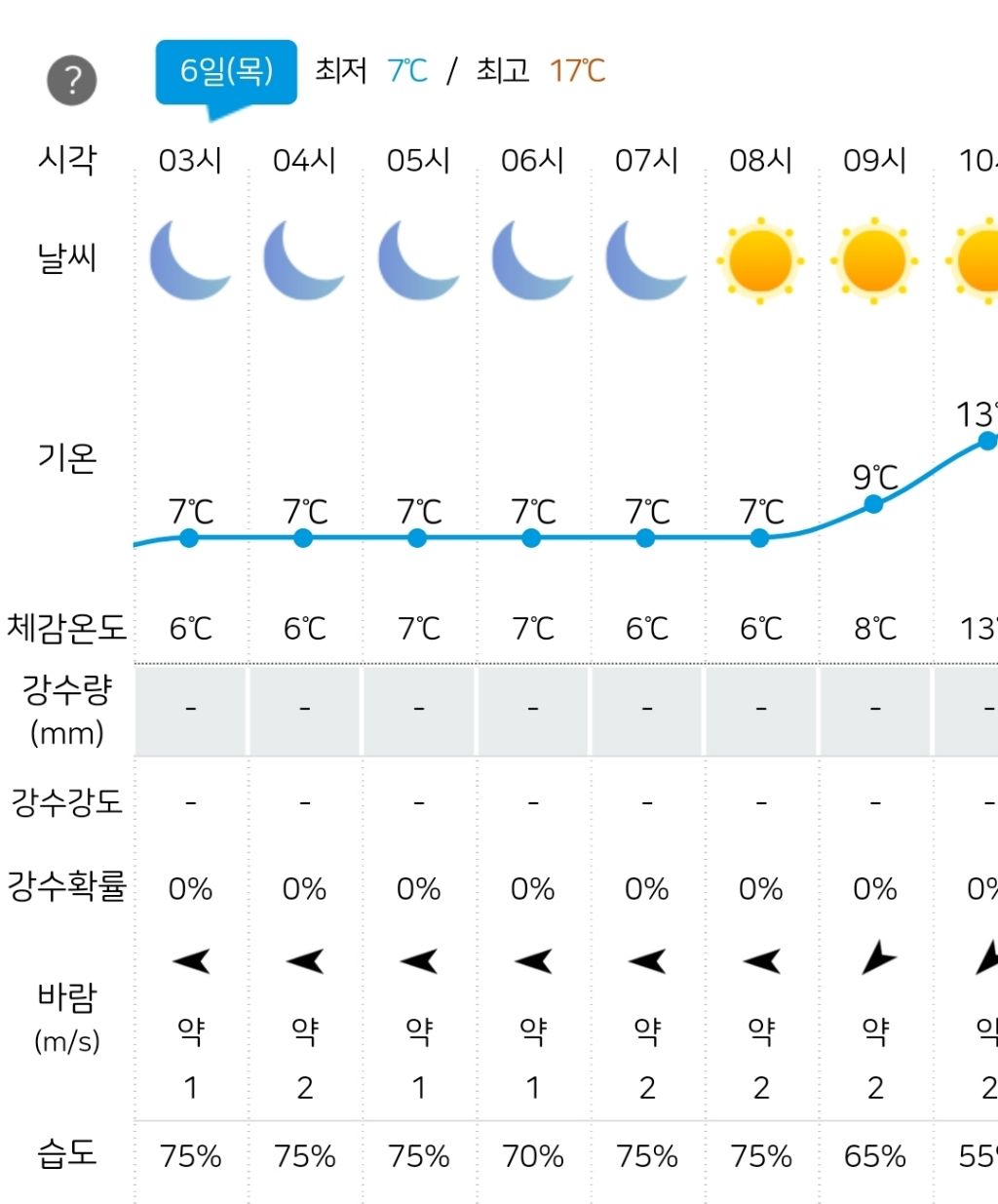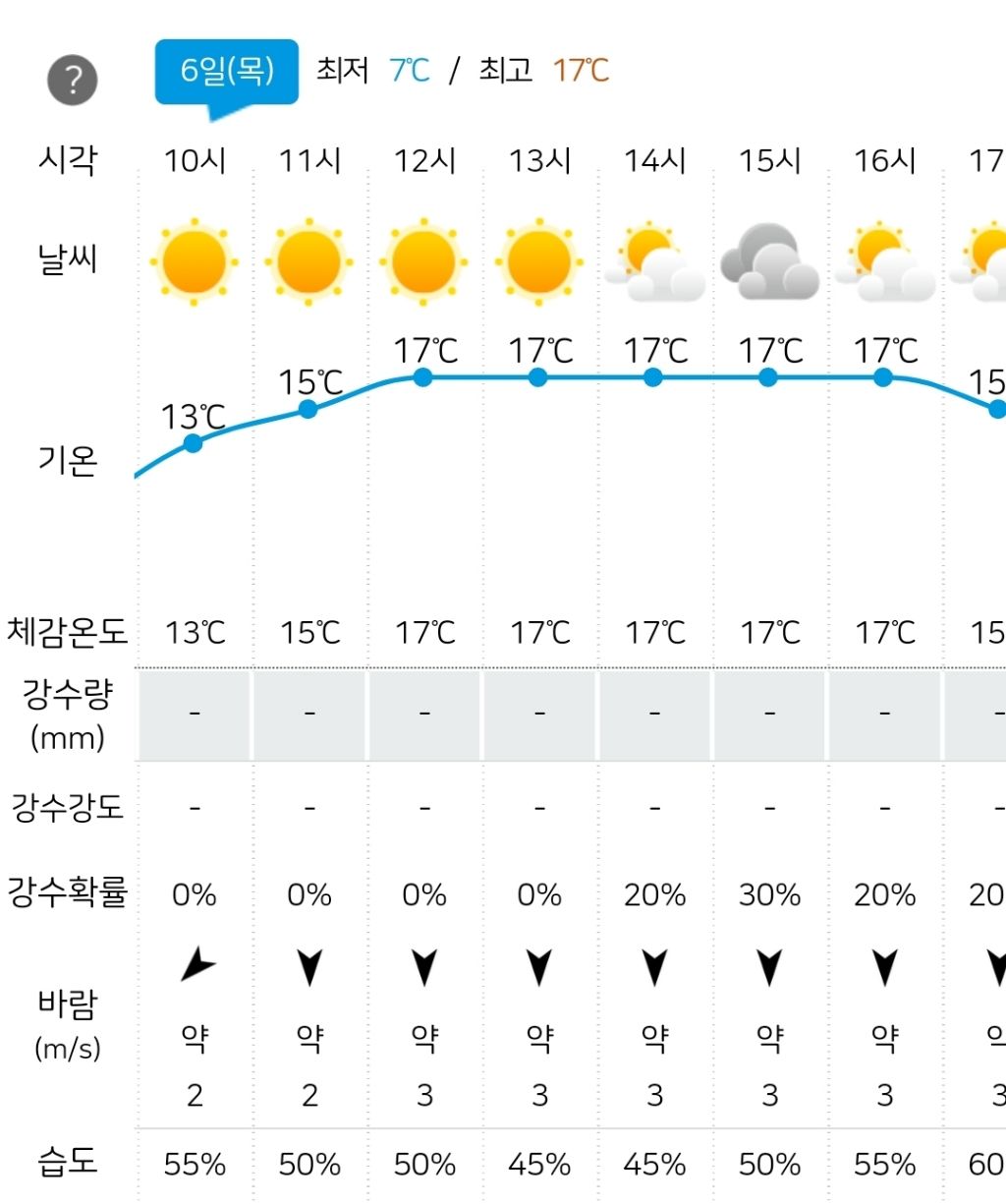 기온(7~17°C), 체감온도(6~17°C), 바람(1~3m/s),