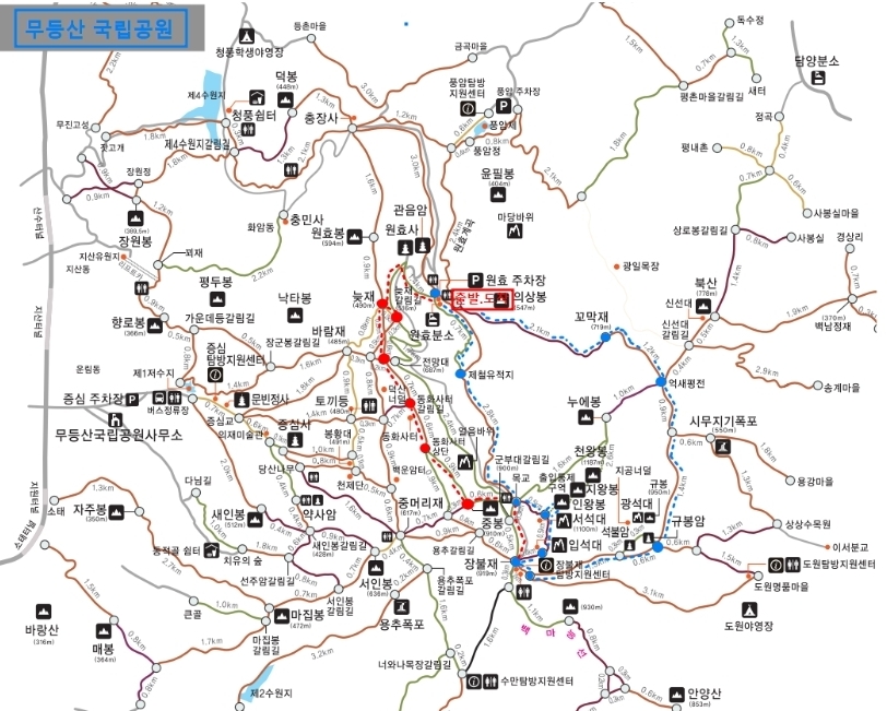 ㅇ 무등산 B코스(최단코스) : 원효사주차장-원효광장(옛길 차단기 아래 좌측 쉼터, 국립공원 스탬프투어 인증)-무등산옛길표지석-목교-서석대(100명산, 달빛산행 챌린지 인증)-인왕봉전망대(왕복 0.8km)-서석대-원효사주차장 원점회귀 (약 9.3km/4시간30분+자유시간)