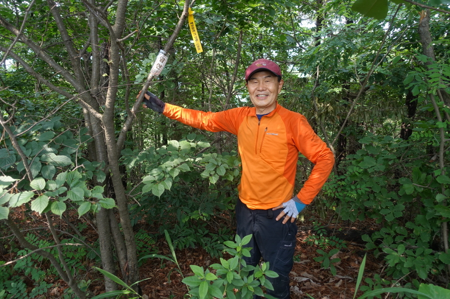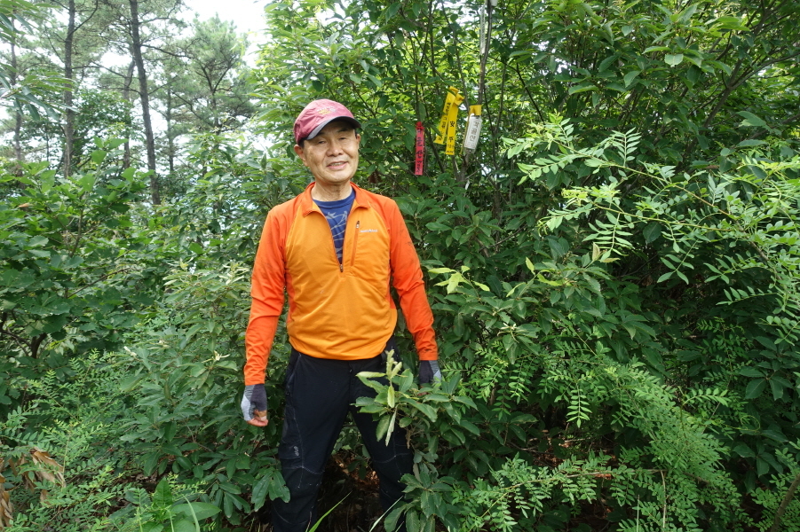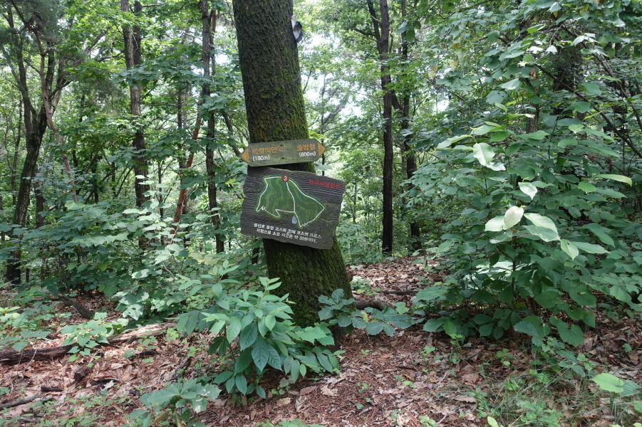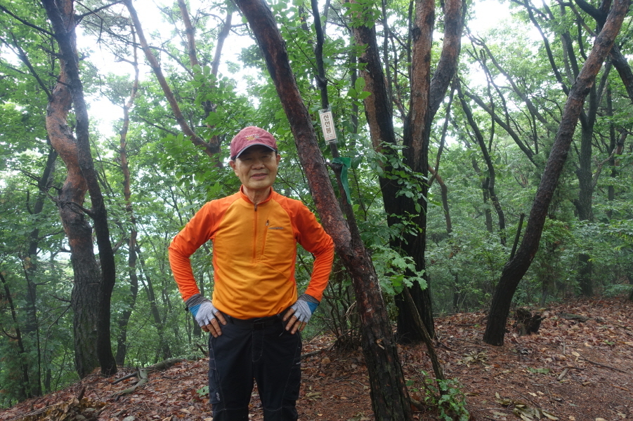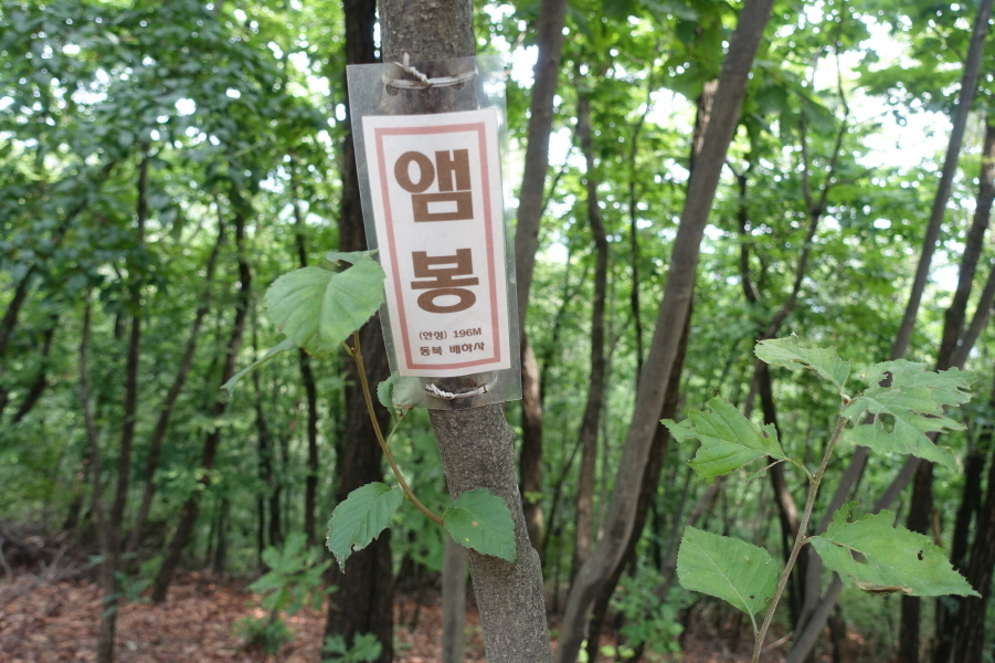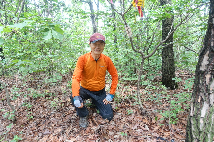 (12;05~12;20)[15분]앰봉 정상 인증사진입니다. 무더운 날 힘들게 오른 이름도 이상한 산 앰봉입니다. 나무로 만든 허름한 간이의자에 앉아 간식과 휴식시간 (12;05~12;20)15여분 갖고 왔던길로 Back 합니다. 좋은 등로 3개와 희미한등로 1개가 합쳐진 정상이다보니 올라온 희미한 등로를 찾지못해 정상에서 잠시 좋은 3개의 등로를 왔다 갔다 하다가 겨우 왔던길을 찾아 되돌아 옵니다.