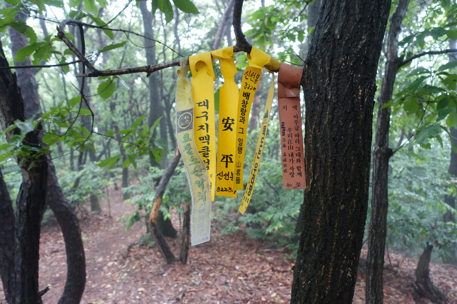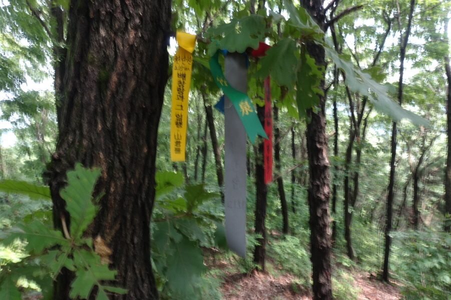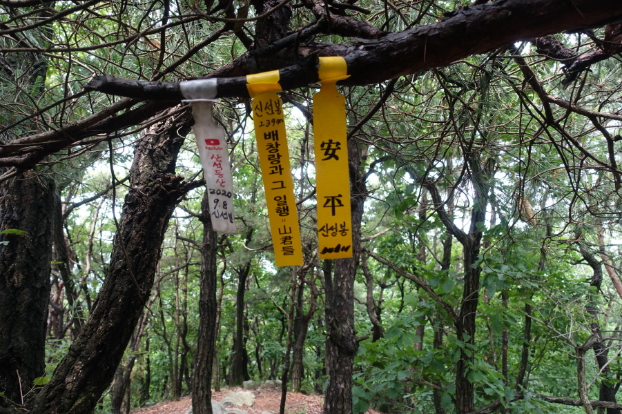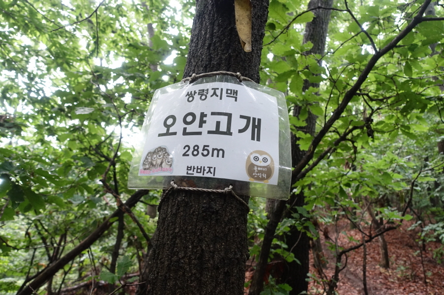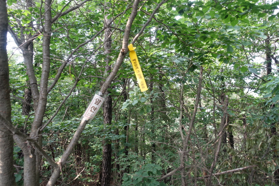 여러장 걸린 선답자님들의 표지기가 신선봉임을 말해준다. 표지기 써서 걸고 인증사진 남기고 완만한 내림길 내려선다. (10;50)반바지님이 부착한 "오얀고개"표지판을 지나 302봉 공터봉에 선다. 이곳을 신선봉으로 잘못표시한 지도도 있는 지점이고 그래서 그런지 신성봉으로 표시한 안평님 표지기와 산석동산님 표지기가 누군가에 의해 땅에 버려져 뒹굴고 있다. 쌍령지맥과 이별하고 좌측으로 잘 정비된 등로따라 내려선다.