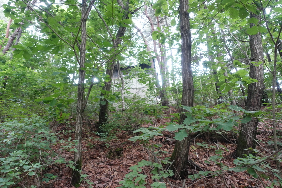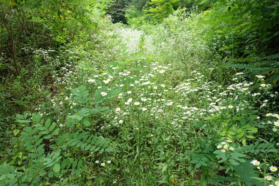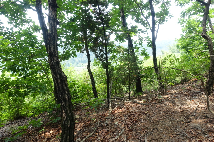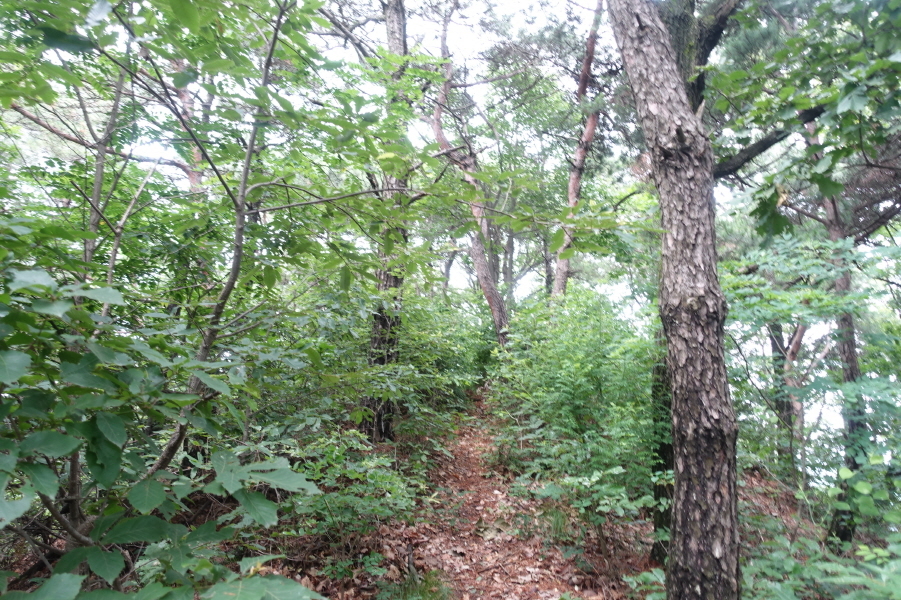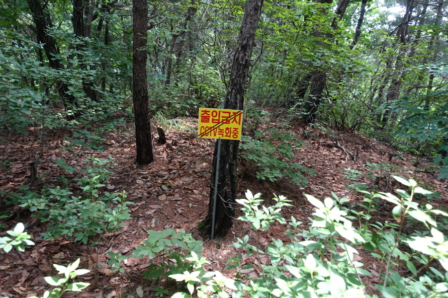 (09;50)"고맙다" 인사 남기고 우측 가드레일을 넘어 철책울타리 아래 임도 따라 내려서다가 임도가 끝나는 지점에서 부대울타리에 바짝붙어 오름길 오른다. 계곡이 유실되는 지점에 계곡따라 비닐끈으로 길게 통제된 지역이 나온다. 비닐금지선 밖으로 간신히 내려 계곡을 건너고 (10;00)부대 후문에 도착 모래주머니 계단길 따라 (양 옆은 픽스로프와 붉은색 비닐테이프 쳐진) 내림길 내려선다. 군부대 모래주머니 계단길이 끝나고 비닐테이프 따라 밖으로 계곡을 우회하여 건너 희미한 다람쥐 사면길을 치고 올라 전면에 보이는 (10;10)주능선에 오른다.[0.5km][20분]