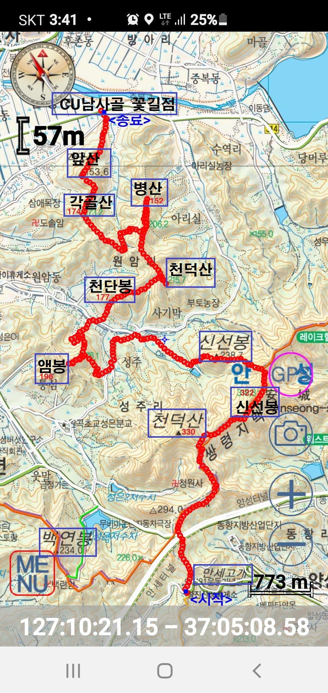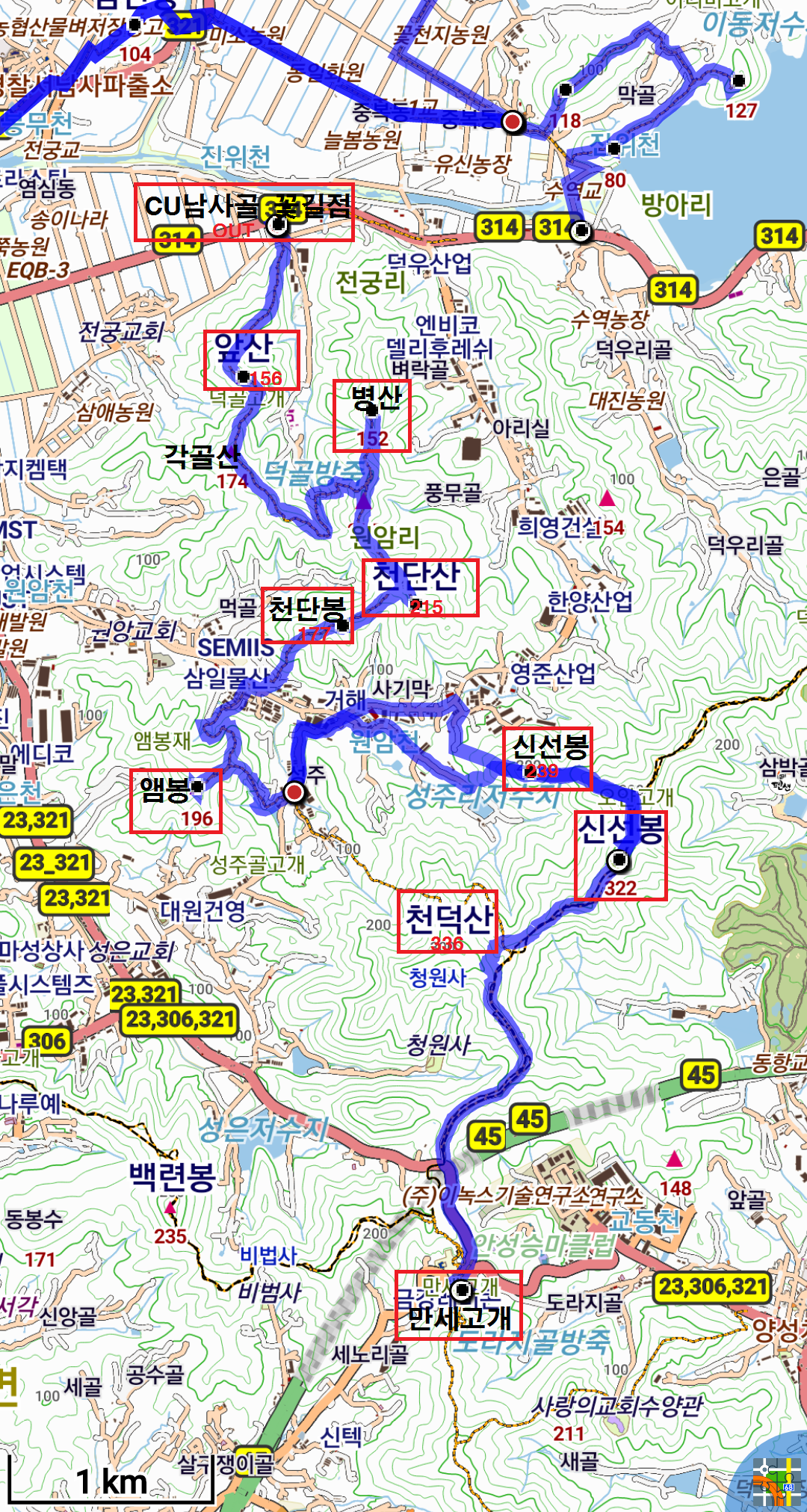 산행코스;만세고개 3.1운동기념관 버스정류장-광복사-도로-공군 제8930부대 입간판-군용도로-천덕산 군부대정문-군부대철책울타리-군용모래주머니 계단 지뢰유실지역 통과- 지뢰.위험지역 표지판 - 오록스맵상 신선봉(1)(322m) -오얀고개-302m공터봉-국립지리원 발행지형도상 신선봉(2)(239m) - 성주교-씨엔지공장-예안 이씨 가족묘지-앰봉(왕복) - 원암4교-전주이씨묘지- 천단봉 - 능선 삼거리 -천단산(왕복) -205봉 3거리 픽스로프깔린 하산3거리-병산(왕복) -205봉 3거리 픽스로프깔린 하산3거리- 정자1.2- 능선 삼거리 - 종교시설물 - 각골산 - 앞산 - 153.3 삼각점봉 - CU 용인 남사꽃길점