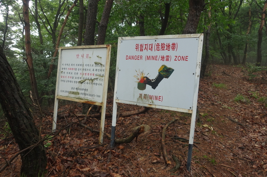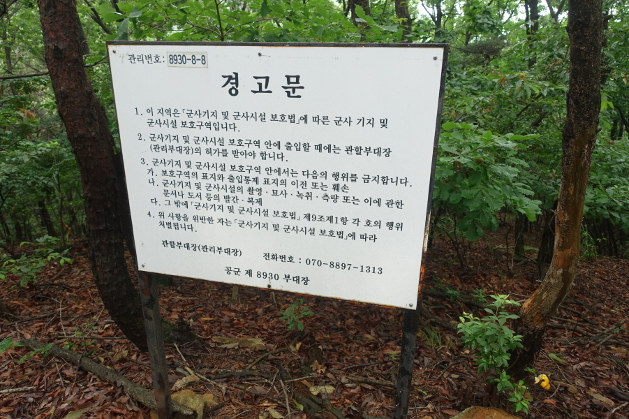 "지뢰.위험지역 경고판"과 "경고문 표시판"이 서있다. 무사히 군부대지역을 통과 하여 긴장을 풀고 약13분간 간식과 (10;10~10;23) [13분]휴게시간 갖는다.