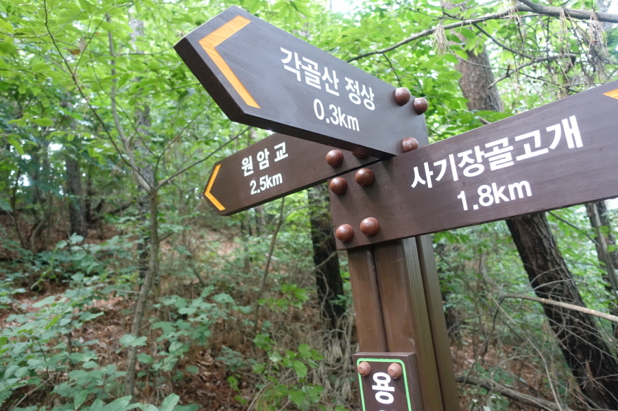 (14;23)각골산 위치를 잘못 반대방향으로 표기한 이정표(각골산정상0.3km/원암교2.5km/사기장골고개1.8km)입니다.