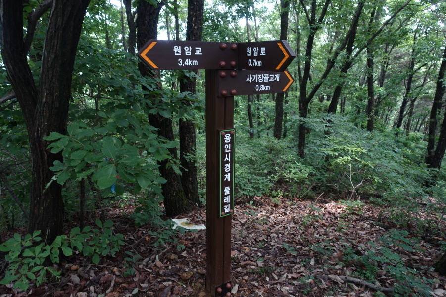 용인시 경계둘레길 이정표(원암로0.7km/사기장골고개0.8km/원암교3.4km)서있다. 선답자님들의 표지기 배경으로 인증사진 남기고 능선갈림 3거리봉으로 돌아와 능선길 이어간다. (13;31)이정표(갈레길160m/바람의언덕250m)를 지나고 205봉 직전 로프매인 하산로 3거리에서 205봉을 오르고 내림길 내려 (13;45)병산에 선다.[1.4km][23분]