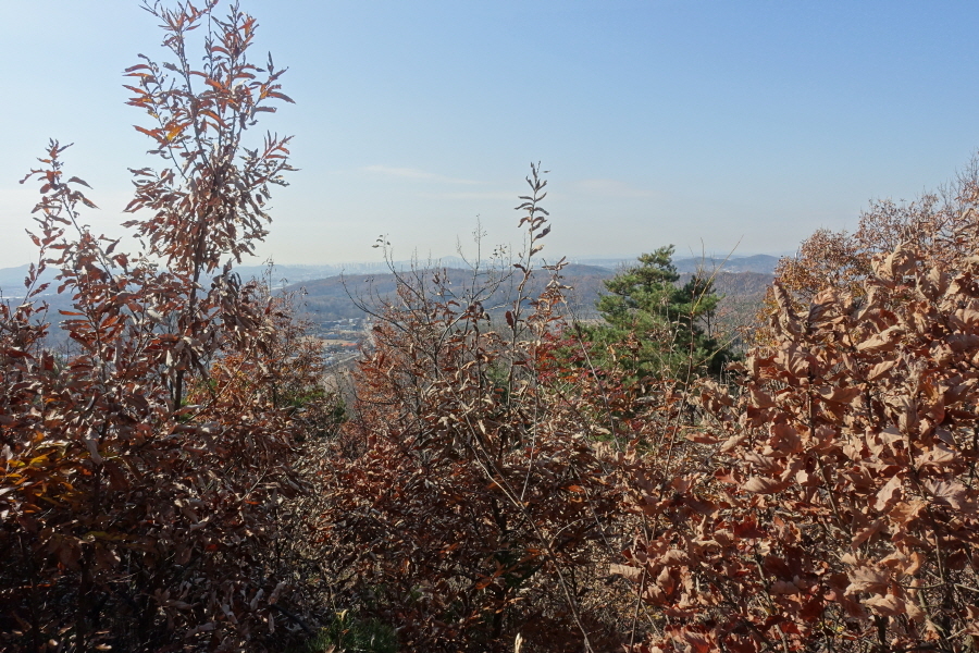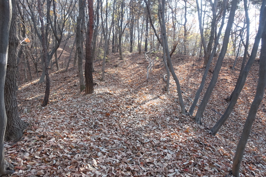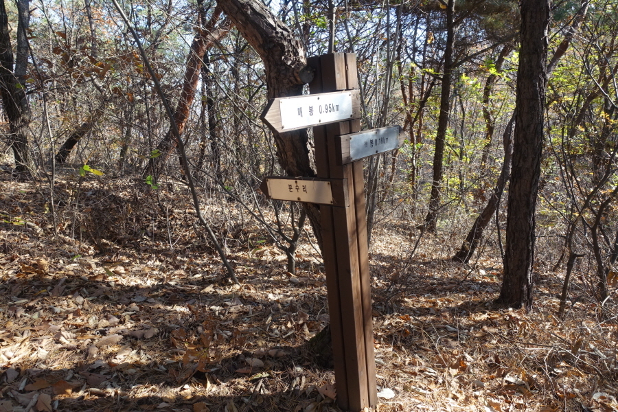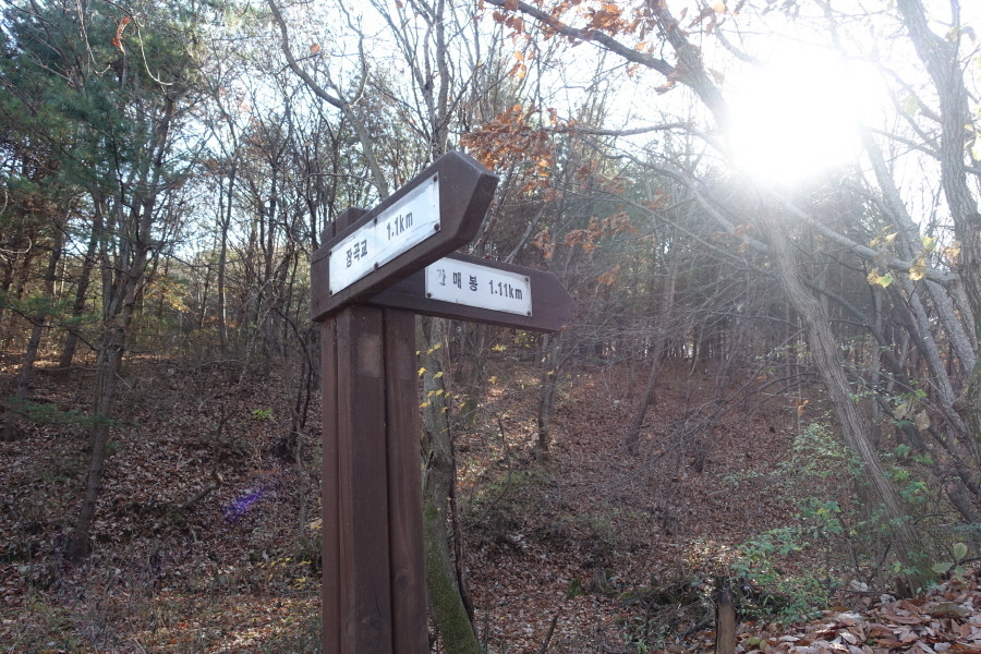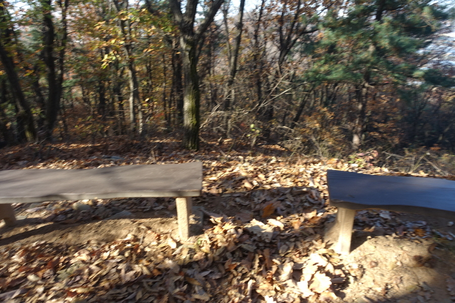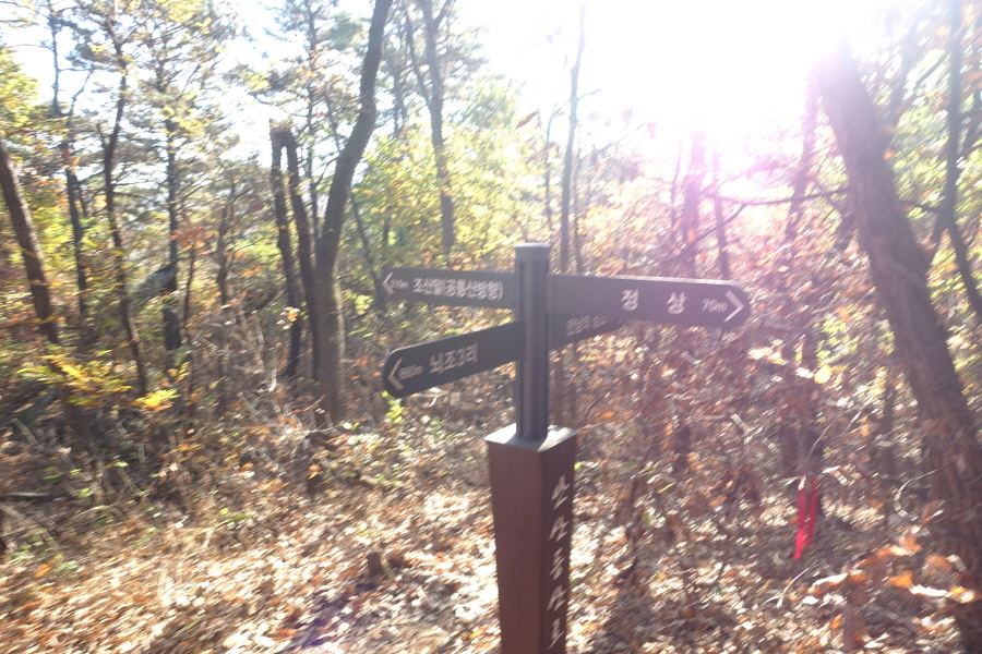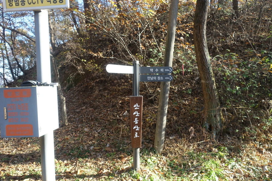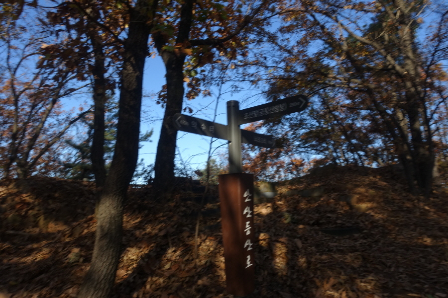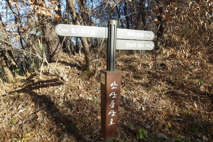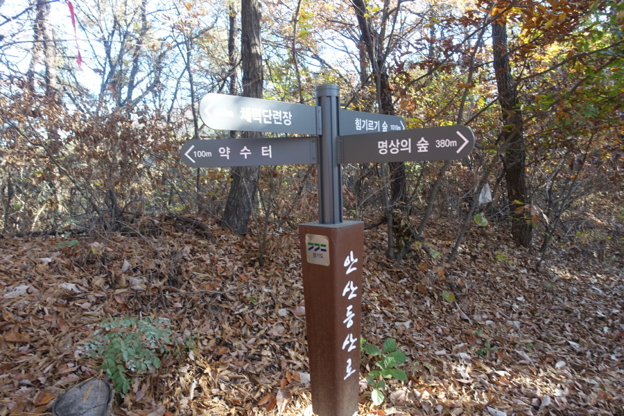 (09;39)이정표(약수터100m/체력단련장/힘기르기숲100m/명상의 숲380m). (09;43)이정표(약수터240m/체력단련장130m/명상의숲660m/만남의장소280m)를 지나 완만하게 임도 따라 오르니 (09;45)장소고개 쉼터다. 운동시설이 있고 아주머니들이 낙엽을 치우는 중이다. (09;46)이정표(정상70m/조산말<공릉산방향>210m/뇌조리860m)에서 조금 위 (09;47)안산정상을 왕복한다.[2.6km][42분]