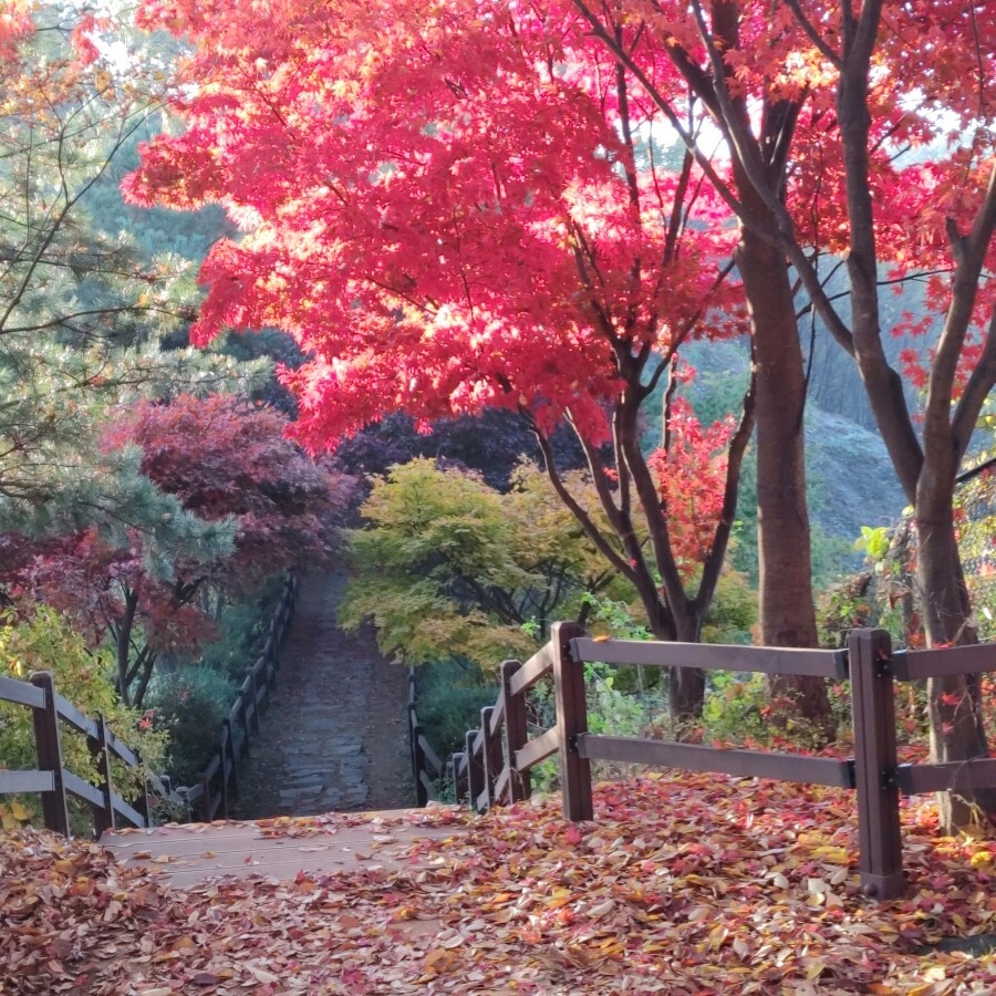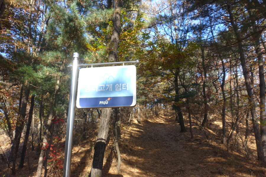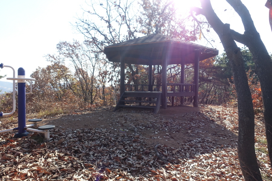 (09;45)장소고개 쉼터입니다. 운동시설이 있고 아주머니들 3분이 낙엽을 치우고 있었습니다.