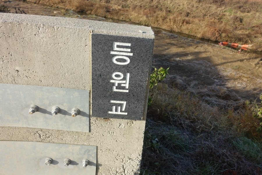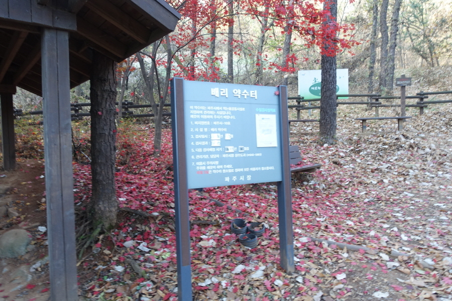 (08;53)약수터 물은 갈수기인 탓인지 나오지 않는다. 옆에 "배리약수터" 설명판이 서있다. 내림길 내려서니 콘크리트 포장도로 만나 포장도로 따라 나오니 위로는 파주로가 지나가고 그 아래 통일로 4거리에서 횡단보도 건너 도로 갓길로 "등원교"를 건넌다.[2.2km][43분]