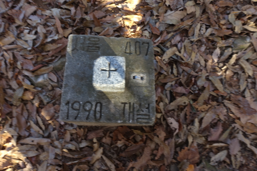 정상에 삼각점(서울407/1990재설)이 있고 서쪽으로 조망이 살짝 트인다. 표지기걸고 인증사진 남긴다.