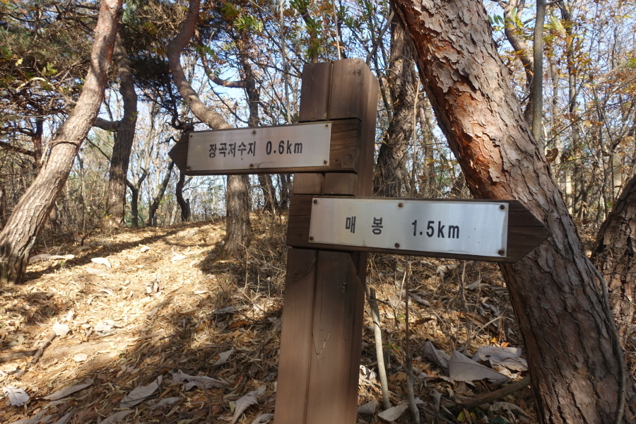 (11;23)삼거리이정표(매봉1.5km/장곡저수지0.6km)입니다.간매봉 정상에서 이정표(매봉1.7km/장곡저수지0.4km/쉼터0.05km)로 되돌와 이정표(매봉1.7km)방향으로 좌회전하여 진행 만납니다.