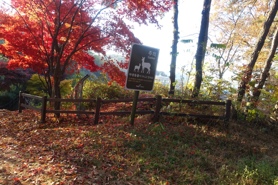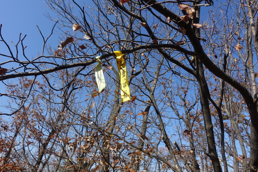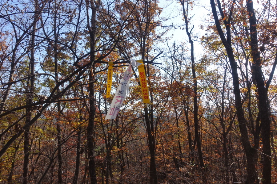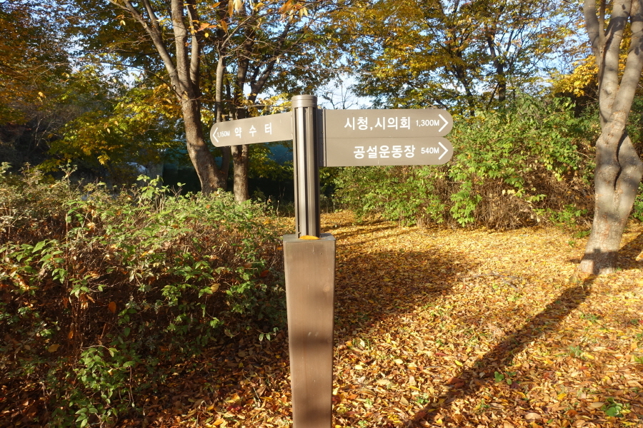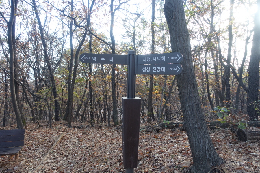 (08;33)이정표(약수터1,500m/시청시의회1,300m/공설운동장540m)를 지나고 (08;51)이정표(약수터50m/시청시의회2,500/정상전망대1,700)에서 능선길 버리고 좌향 이정표(약수터50m) 방향 급경사 내리막을 내려선다.