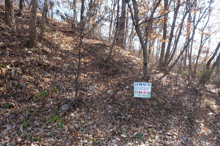 (11;35)임도삼거리에서 왼쪽 도로를 따라 약 350m를 걷다가 고개에서 우측으로 계단을 올라가도 되지만 안내판(산림보호.산불조심)서있는 급경사길을 올라서 좌측으로 능선 진행합니다.