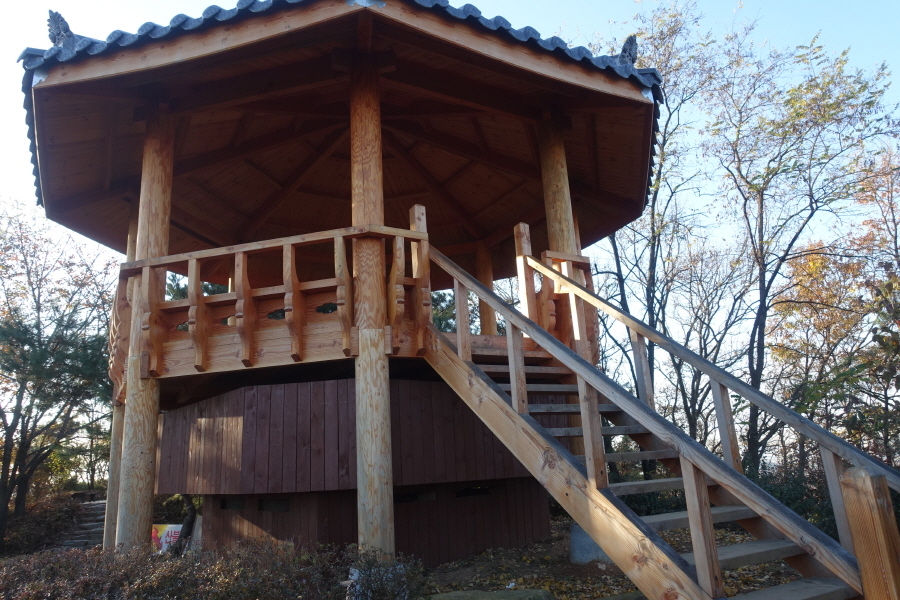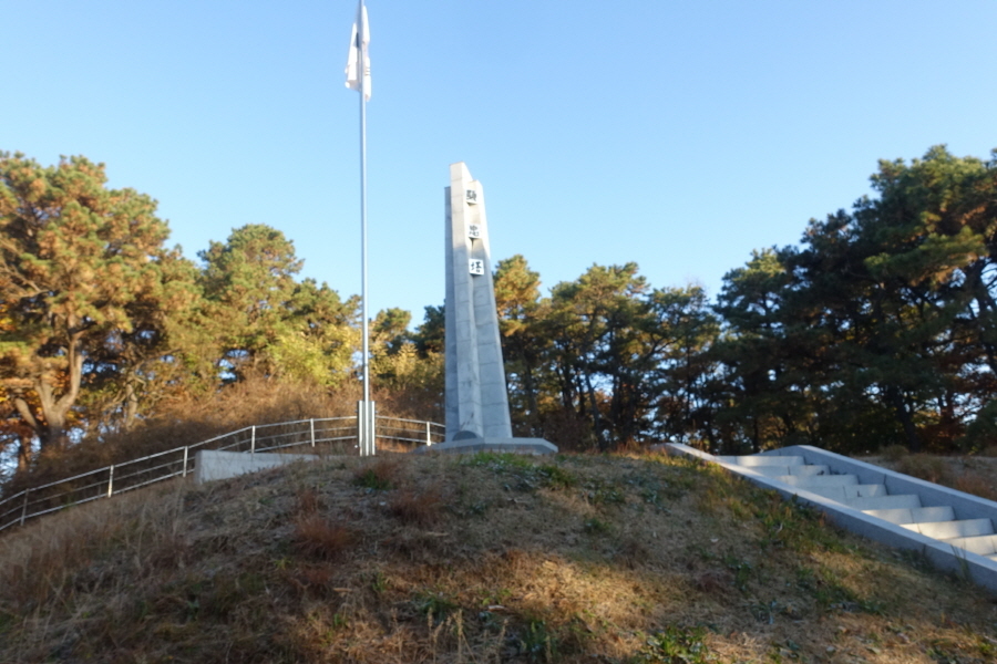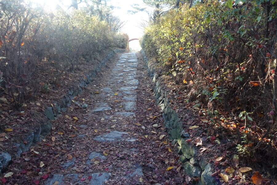 목책 계단을 올라서니 산길 등로는 우측 허리길로 이어진다. (07;45)금용사 절집이 등로 우측 아래 내려다보인다. 오름길 올라 주능선에 서니 (07;58)이정표(장안빌리지220m/금릉동 전원마을880m)를 만나 우측 장안빌리지 방향으로 간다. (08;00) 헌충탑을 만나고 헌충탑을 오르는 긴 돌계단을 밟고 내려선다.