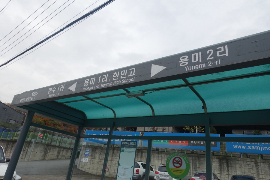 12;35 "용미1리.한민고"버스정류장입니다. 산행종료합니다.T맵 대중교통 검색 하니 [774번 버스]는 약15분 후 도착입니다.