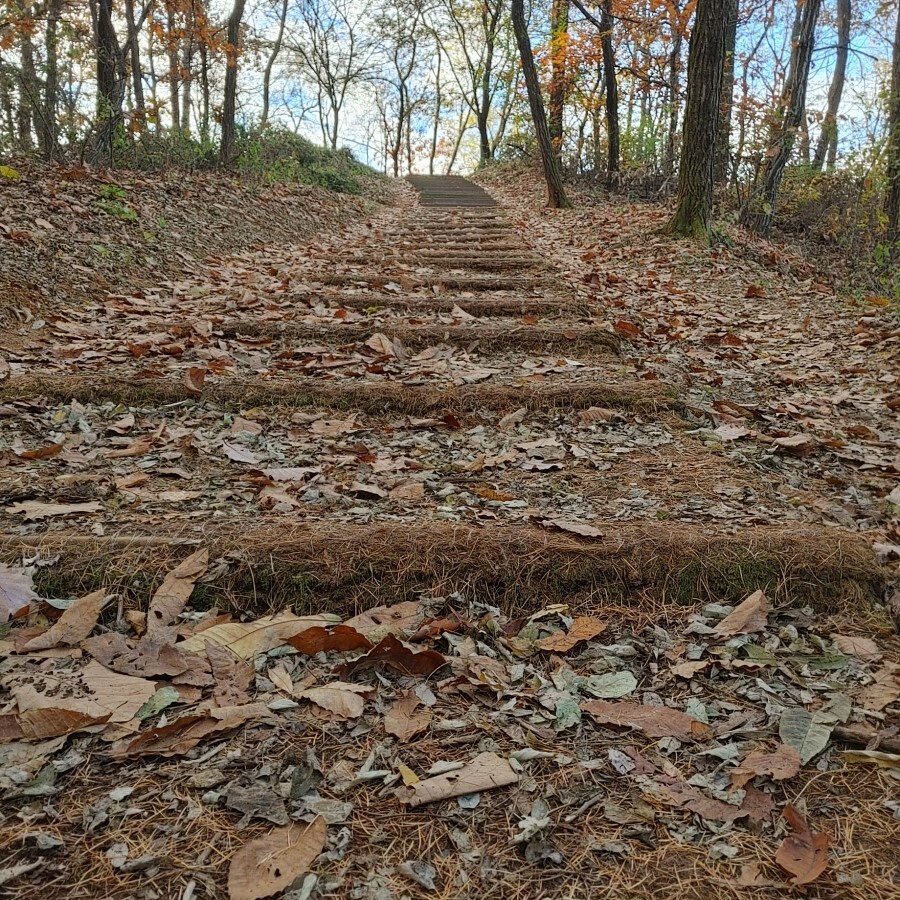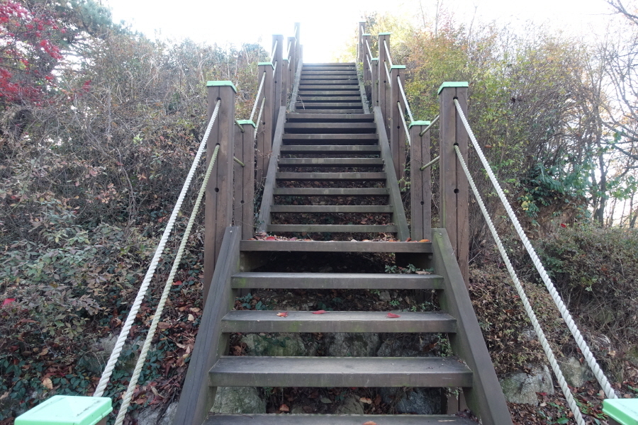 07;50 교차로에서 횡단보도 건너 직진으로 진행 2번째도로 지나 좌측에 만나는 유로주차장 옆 등산로입구 목책계단입니다.