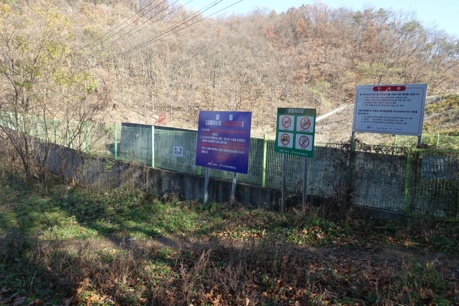 문화재청에서 조선왕릉(삼릉)의 관리를 목적으로 능선상에 쳐놓은 철조망이다. (10;25)정상에서 삼릉의 철망울타리를 따라 650m 정도를 가니 펜스가 끝나고, 능선길을 따라 더 가니 (10;43)우측으로 공릉 저수지가 내려다보인다. (10;48)공릉저수지 안내판 서있는 (10;48)저수지 배수로 다리를 건너 뚝방으로 오른다. 공능저수지 뚝방을 건너 (10;50) 이정목(***/***/ 공릉산 등산로 방향)입구(날머리)에 도착한다. 우측으로 돌아가 도로를 만나 우회전하여 진행한다. 도로를 따라 조금 진행하니 (10;54) 도로좌측에 석재 "지하여장군" "천하대장군" 석장승과 석탑이 있어 무엇이 있었는지 매우 궁금하다. 강변매운탕집을 지나자마자 (10;57)"무공해쉼터" 표석 있는 삼거리에서 도로 왼쪽 숲길로 오른다. (10;58)이정표(간매봉 1.11km/장곡교1.1km)를 만나고 이정표(간매봉 1.11km)방향을 오르면 (11;05)벤치가 있고 매봉삼거리 이정표(쉼터0.05km/매봉1.7km/장곡저수지0.4km)를 만나고 이정표(쉼터0.05km)방향 50m거리의 봉우리가 간매봉 정상이다[2.4km][42분]
