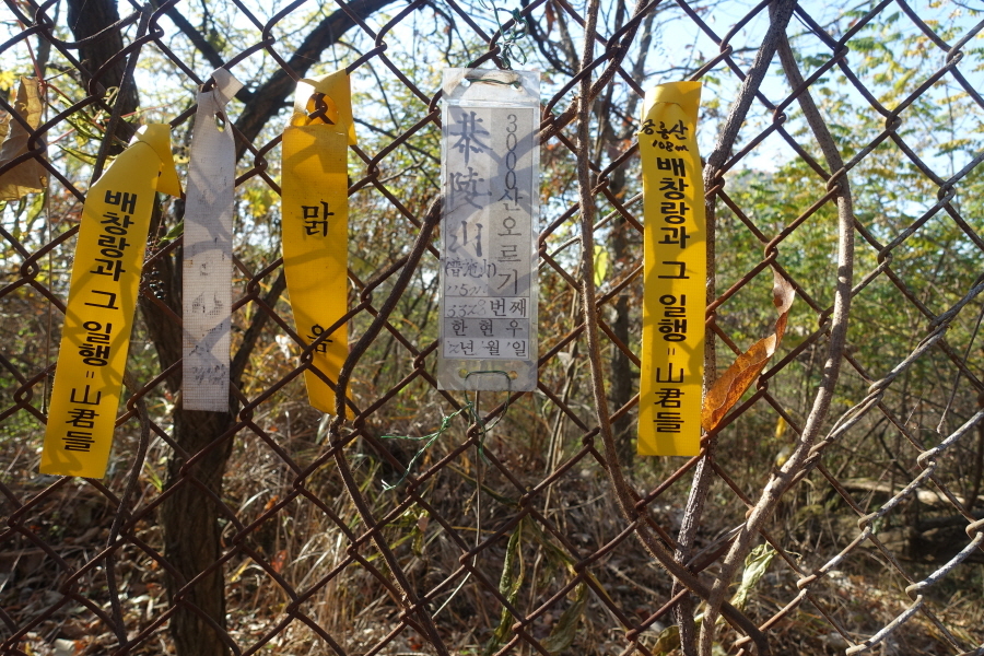 (10;15~10;25)[10분](10;15)공릉산 정상 철조망 울타리에 선답자님들의 표지기 걸려있고 故한현우님의 작은표지판이 부착되어있습니다. 그런데 네비가 조금더 가야 공릉산 정상이라고 가리키고 있어 선답님들의 표지기 옆에 "공릉산 표시 하지 않은 배창랑과그일행=山君들"표지기 부착하고 네비상 공릉산 정상을 찾아갑니다. 그런데 정상으로 보이는 곳도 없어 네비 다시 확인하니 네비가 정상을 지난 것으로 나타납니다. 약 100m 되 돌아와서(10;25) "공릉산 표시된 배창랑과그일행=山君들"표지기 걸고 인증사진 남깁니다. 공릉산 정상에서 네비 탓에 정상 찾느라 약10여분 허비한 셈입니다.표지기 2장 건 사연입니다.