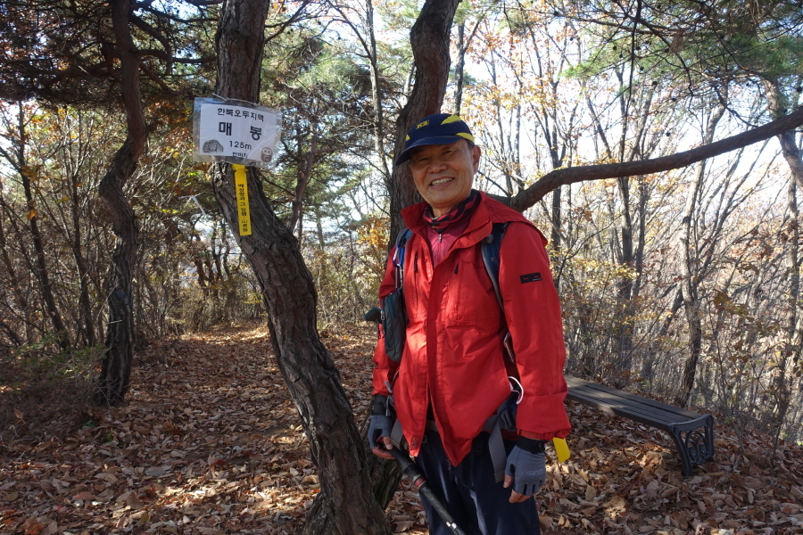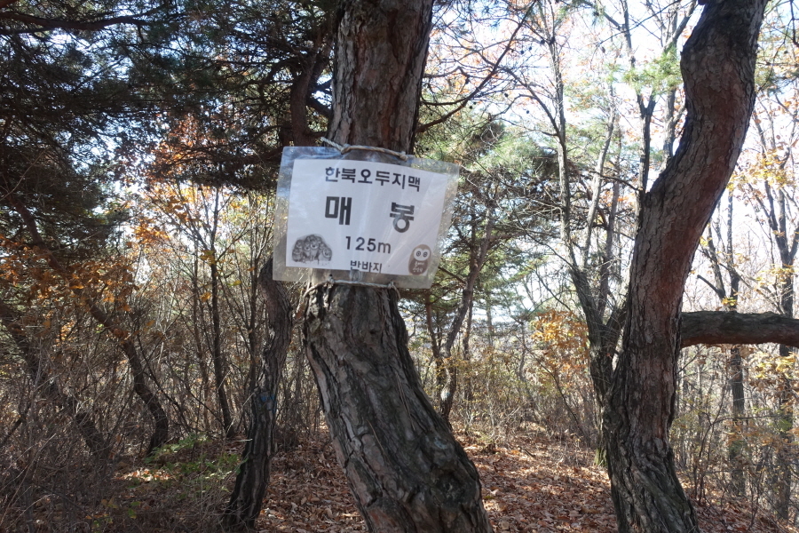정상 가운데에 소나무가 있고 벤치 2개가 있다. 소나무에 반바지 님의 "한북오두지맥 매봉125m"비닐코팅 정상표지판이 걸려 있다. 화요일 (11/9)만나고 토요일(11/13)또 만나는 신한북정맥 길이다.