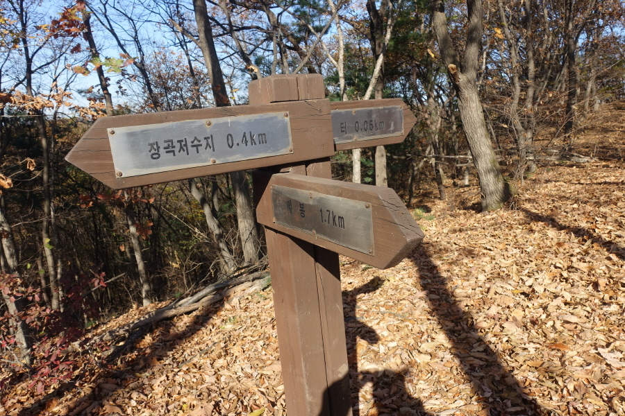(11;05)벤치가 있고 매봉삼거리 이정표(쉼터0.05km/매봉1.7km/장곡저수지0.4km) 입니다. 쉼터0.05km 가 간매봉정상입니다.