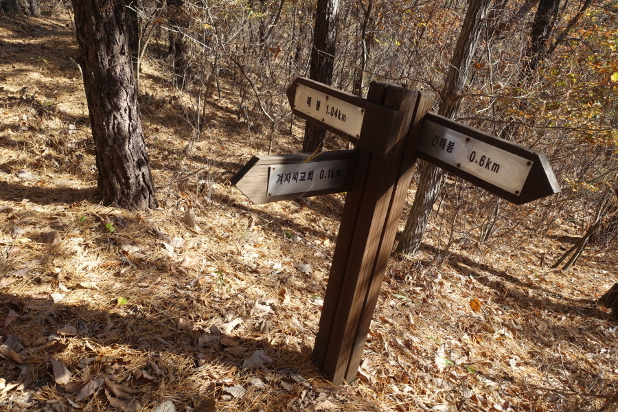 (11;28) 이정표(매봉1.04km/계자씨교회0.1km/간매봉0.6km) 서있는 능선길 만나고 좌측 이정표(매봉1.04km) 방향 입니다.