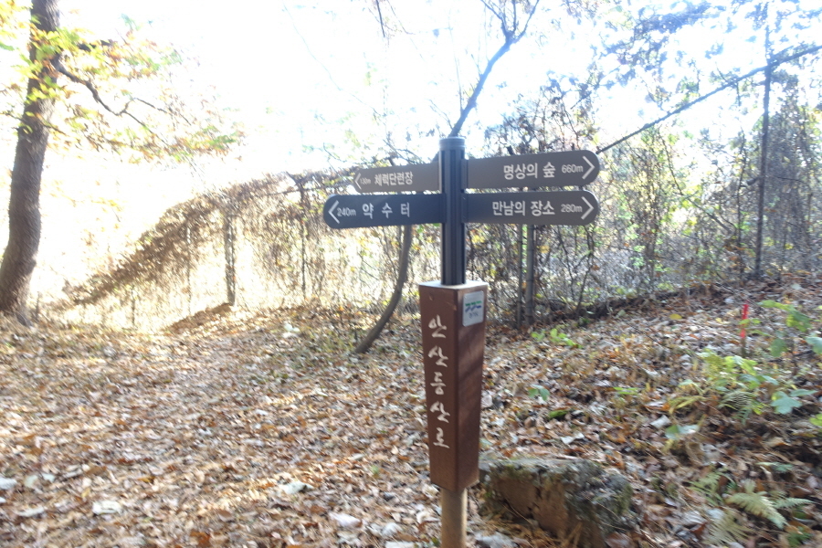 (09;43)이정표(약수터240m/체력단련장130m/명상의숲660m/만남의장소280m)입니다.