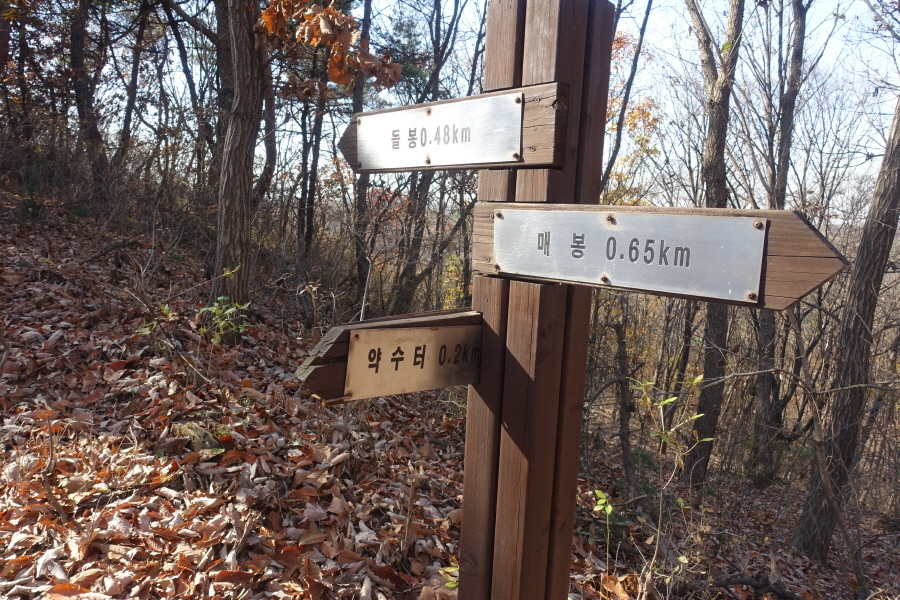 (11;58) 약수터 갈림이정표(들봉0.48km/약수터0.2km/매봉0.65km)입니다.