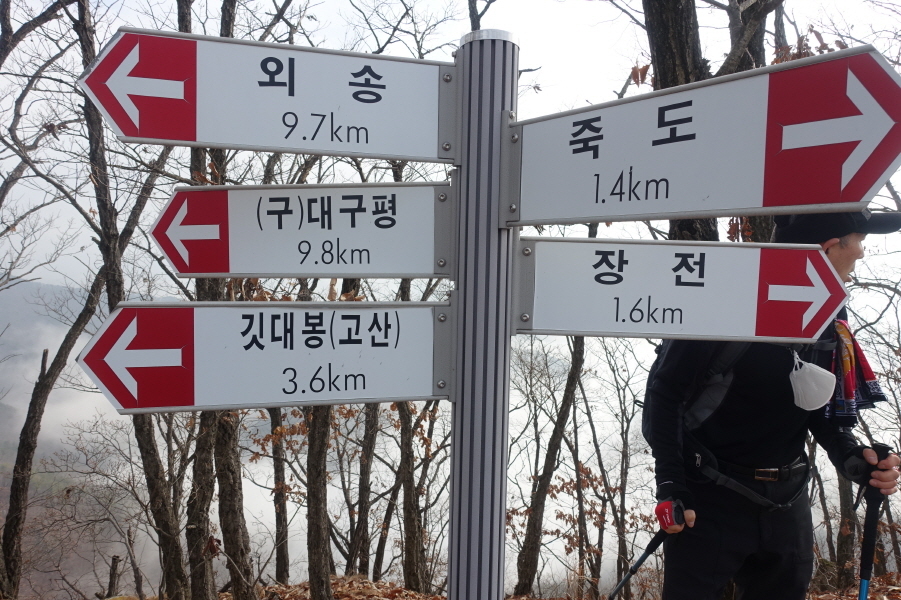 이정표(깃대봉3.6km/대구평9.8km/외송9.7km/죽도1.4km/장전1.6km) 서있는 3거리다. 이정표 (깃대봉3.6km)방향 급경사 내림길 내려선다. (10;52)건너편능선과 안개낀 풍광을 조망한다. 픽스로프와 안전시설이 설치되어 조심스럽게 잡고 안부로 내려선다. 안부 이후도 암릉을 안전시설 잡고 바위암릉을 오른다. (10;55)바위 암릉길 조망 즐기면서 진행한다. (10;57)앞에 봉에 올라서니 고산정상 깃대봉이 조망된다. 안부로 떨어졌다가 앞에 있는 봉에 오르면 이후 등로는 비교적 부드럽게 보인다.[1.1km][24분]