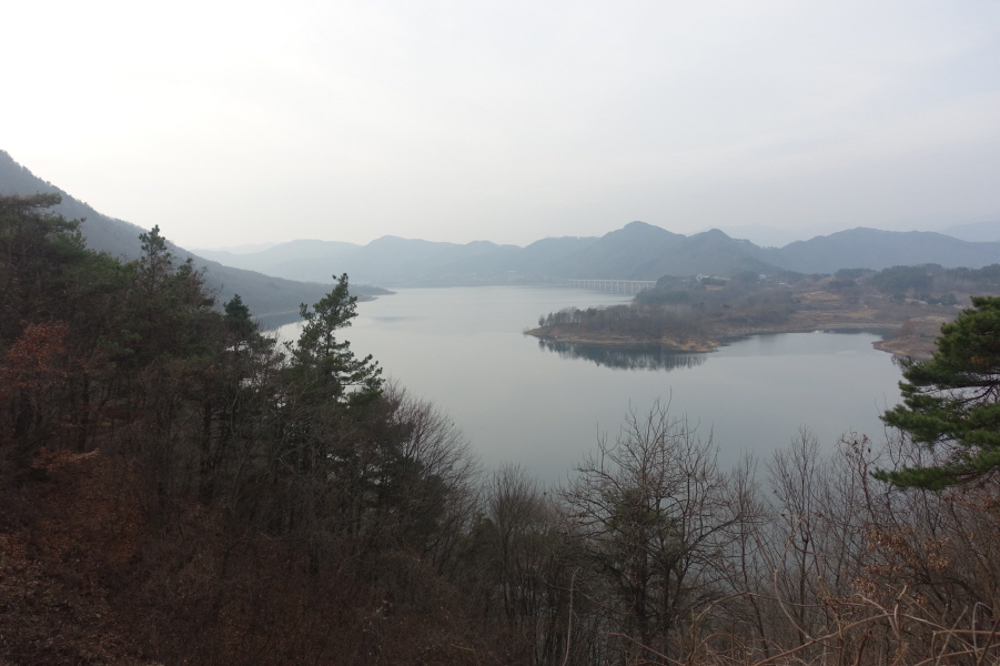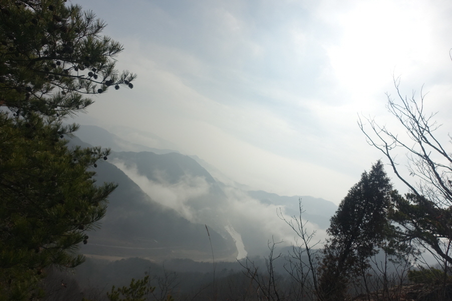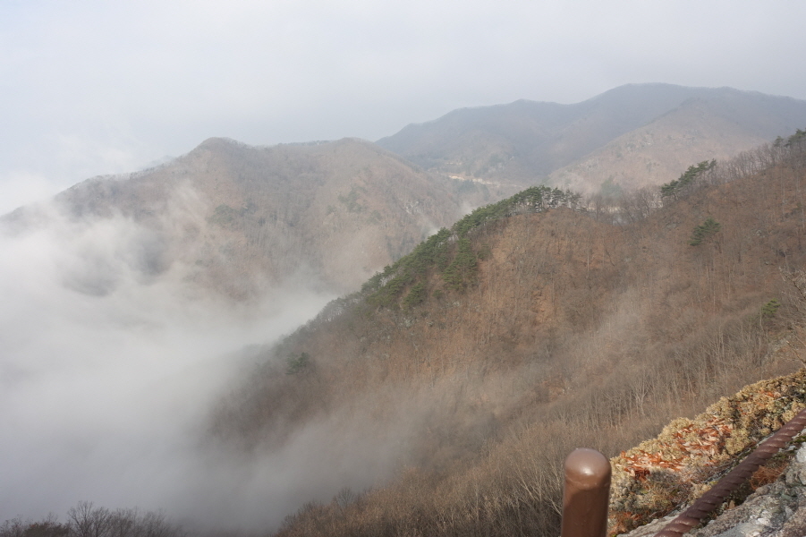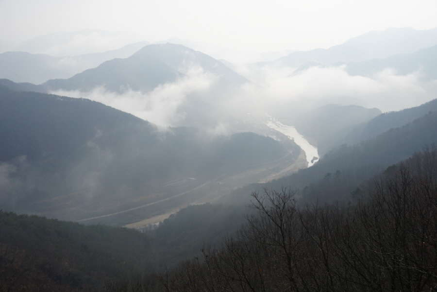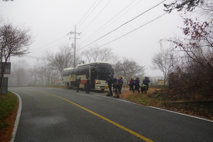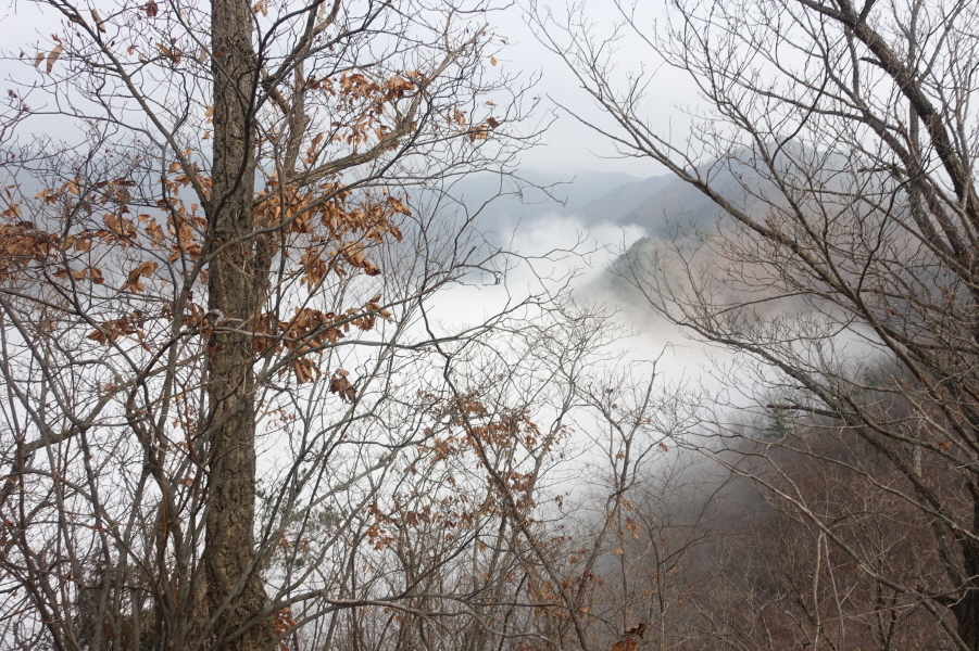 차는 중간 인삼랜드휴게소에서 (09;05~09;27)[22분]휴게시간 갖고 산행날머리 근처 3거리를 지나 구비구비돌아 (10;18)산행들머리 죽도고개에 도착 바로 산행 시작합니다. 따뜻한 겨울 날씨 탓 짙은 안개가 끼어 시야 확보가 어려워 조망이 없어 아쉽습니다. 그래도 2년전 추억을 되새김하면서 마음속으로 조망을 즐깁니다.