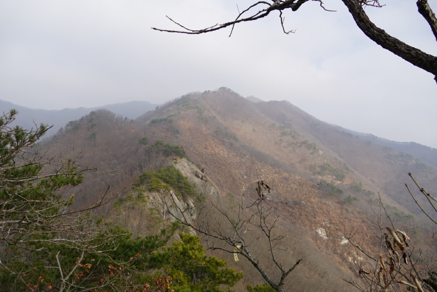 14;41 대덕산에서 내려온 능선상의 바위봉입니다. 그래서 좌측계곡쪽 길이 그리도 험했나 봅니다.