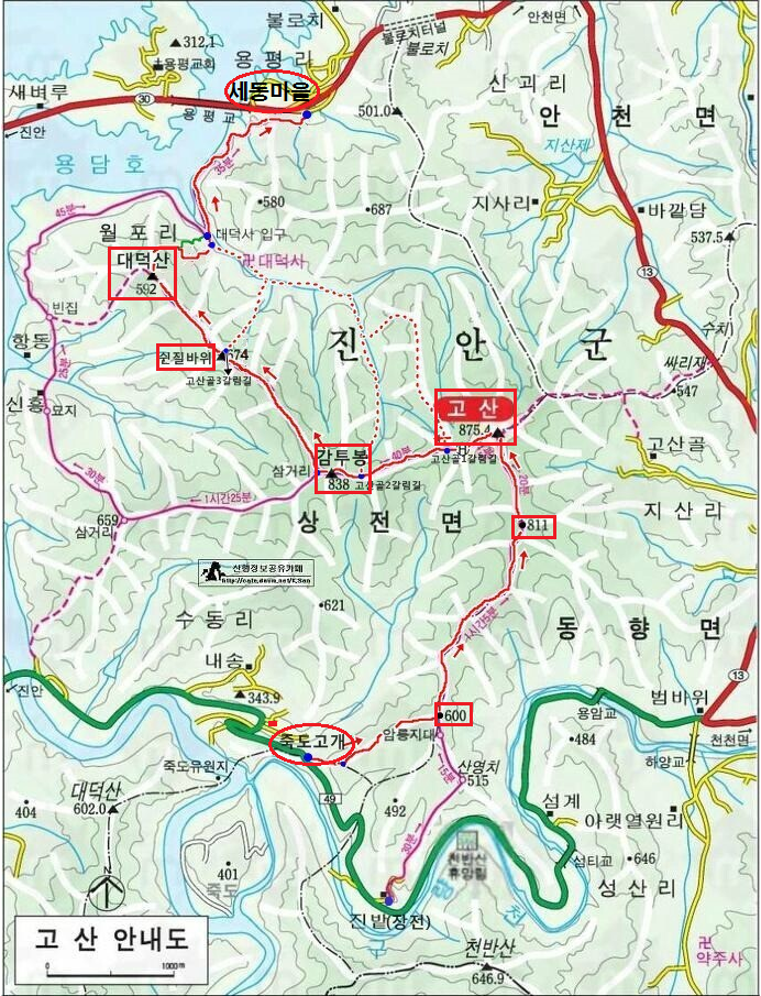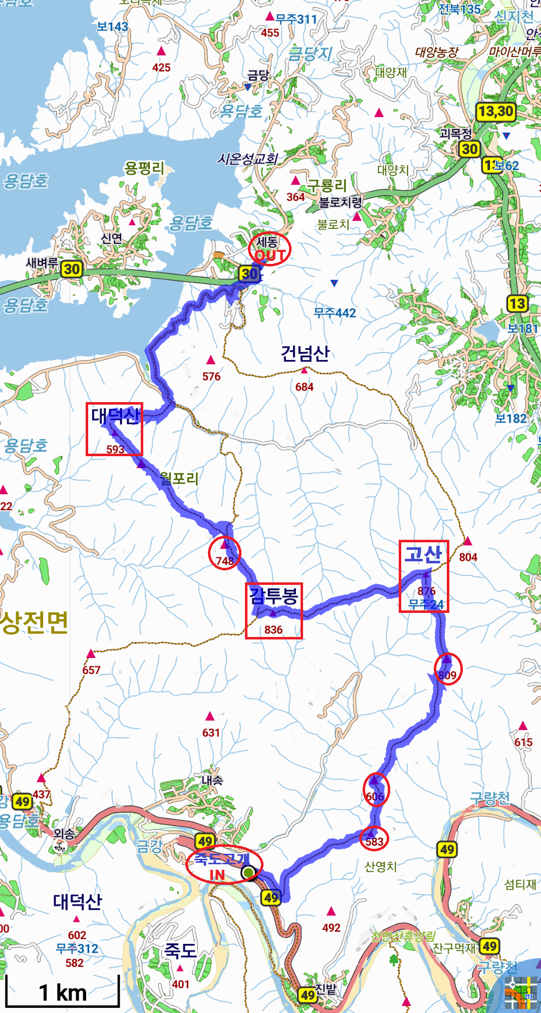 산행코스 : 죽도고개→600→710→811→고산(깃대봉875.4m)→헬기장→감투봉(838m)→쉰질바위<우회>→대덕산(592m)→ 우측능선→우측계곡 너덜길→대덕사입구→ 임도→세동마을(구룡교차로 공터)