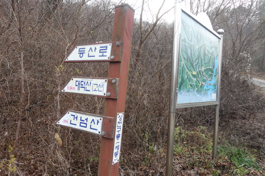 14;54 상전구룡(세동) 이정표(등산로/대덕산<고산>6.9klm/건넘산2km)입니다. 건넘산 왕복 4km가 미답으로 남아 아쉽습니다.