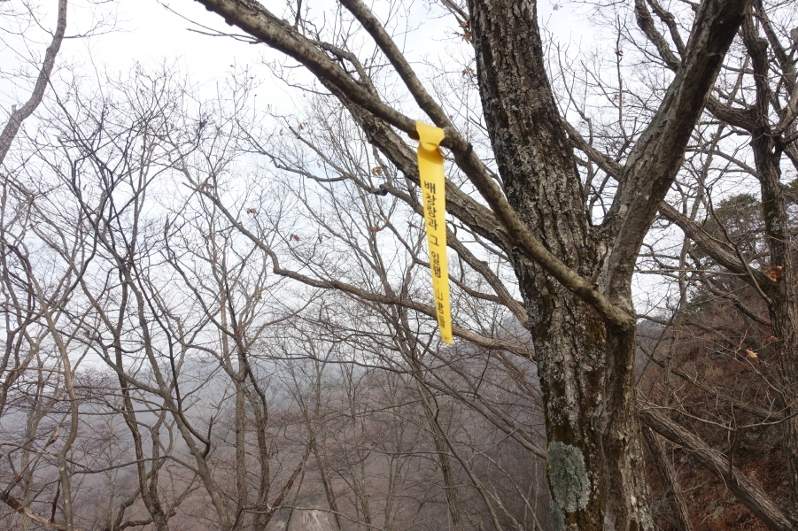 대덕산 방향은 아무런 표시가 없습니다.(cf 좋은 길 따라 내려서면 고산골로 빠져 대덕사 하산길에 들어 대덕산을 놓치는 중요한 길목입니다. 더구나 산악회에서 안전을 위해 고산골 방향으로만 바닥지를 깔아두어 많은 많는 대원들이 혼란을 겪은 모양입니다.)여기서 우측 사면 길을 이용하여 좌측 능선으로 올라갑니다. (cf 올라가면 바위지대가 있는 내리막길이 나오고 바위지대를 따라 내려가도 되고, 바위지대를 우측으로 우회하여 내려가도 됩니다. 바위지대는 겨울철에는 피하는 것이 좋습니다. 홀더가 많이 있으나 미끄럽기 때문입니다.)