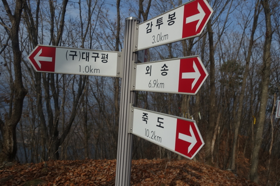 (12;38) 외송 마을 갈림길 이정표(외송 3.9km/ <구>대구평 4.0km/ 죽도 7.2km/ 깃대봉<고산>2.2km)입니다. 대덕산을 하지 않고 안전하게 하산이 가능한 외송마을 갈림길입니다.