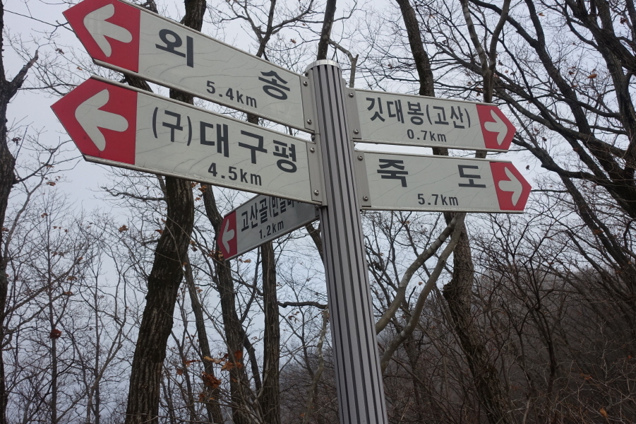 인증사진 남기고 좌향 이정표(외송6.1km) 방향 내리막길을 따라 내려간다. 내려갔다가 다시 올라가면 (12;04)헬기장(약4분)이 나오고, 직.우측으로 방향을 틀어 내려가면 (12;07)첫 번째 고산골 갈림길이정표( 외송 5.4km/<구>대구평 4.5km/ 고산골 1.2km/ 깃대봉<고산> 0.7km/ 죽도 5.7km)가 서있다.