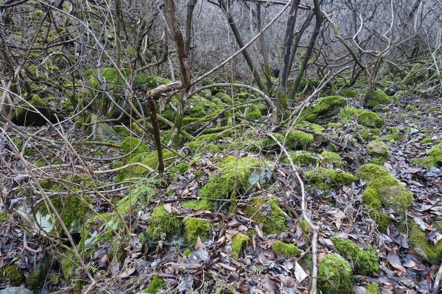 바위지대 올라가기 직전 아래로 바닥지가 보여 우회하라는 뜻으로 알고 내려서니 고산골방향입니다. 좌측 위로 사면길이 희미하게 보여 바위지대를 좌측에 두고 거의 개척으로 우회하여 어렵게 바위지대 능선에 올라섭니다. 능선따라 대덕산을 향합니다.