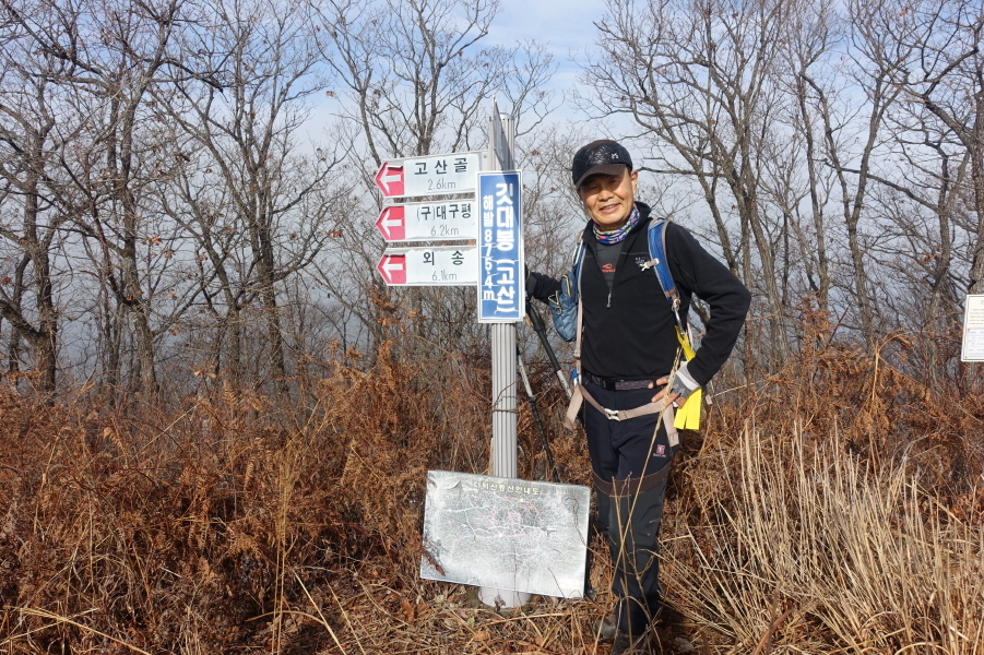 인증사진 남기고 우측으로 이정표(고산골0.7km) 방향으로 틀어 내려간다. 내려가면 곧바로 갈림길(자세하게 살펴보지 않으면 우측 갈림길을 지나칠 수가 있음)이 나온다. 직진길을 무시하고 우측(표지기 많이 부착되어있고 가파르고 길 흔적이 있음)으로 이어지는 내리막길을 따라 내려간다.