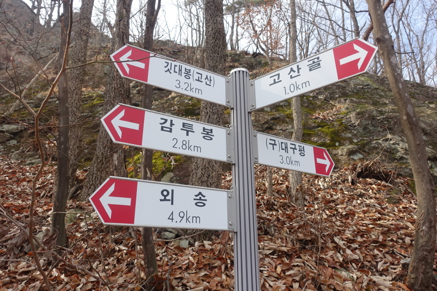 (12;16)두 번째 고산골 갈림길이정표 (외송 4.4km/ <구>대구평 3.5km/고산골 2.3km/ 깃대봉<고산> 1.7km)입니다.