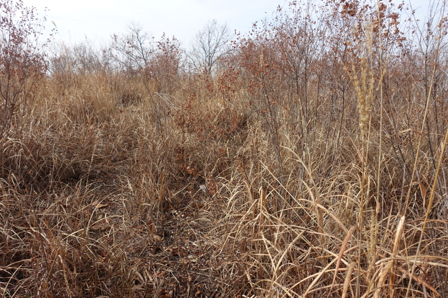 여기서 우측 사면 길을 이용하여 좌측 능선으로 올라간다. (cf 올라가면 바위지대가 있는 내리막길이 나오고 바위지대를 따라 내려가도 되고, 바위지대를 우측으로 우회하여 내려가도 된다. 바위지대는 겨울철에는 피하는 것이 좋다. 홀더가 많이 있으나 미끄럽기 때문이다.)