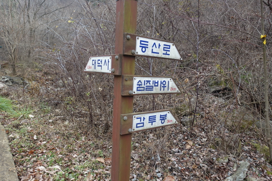 천신만고 끝에 내려선 이정표(등산로/쉼질바위 2km/ 감투봉 3km/대덕사 0.5km)이 있는 진무로(콘크리트 포장도로)임도다.