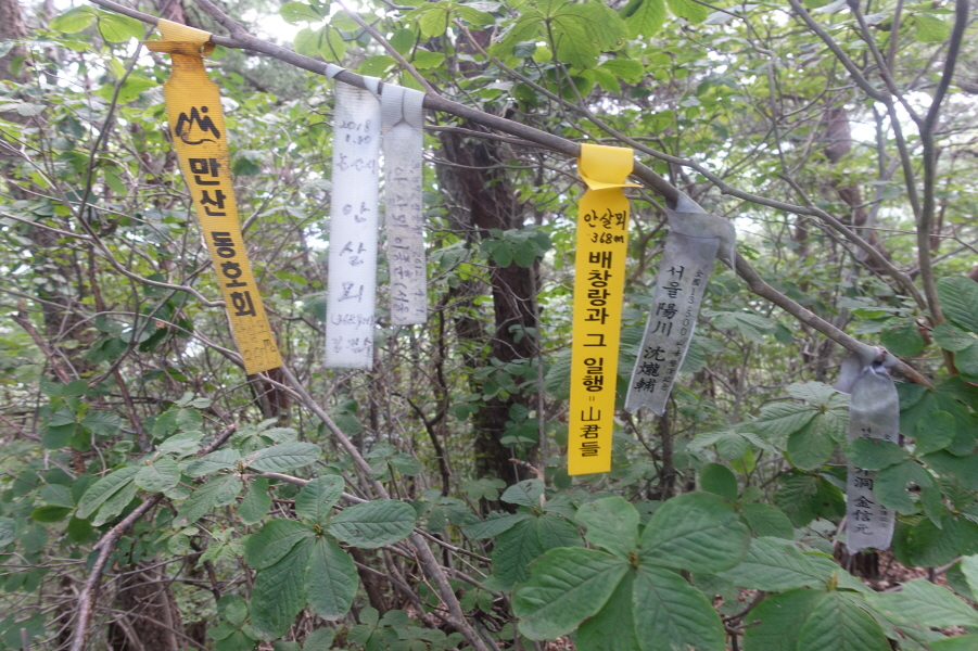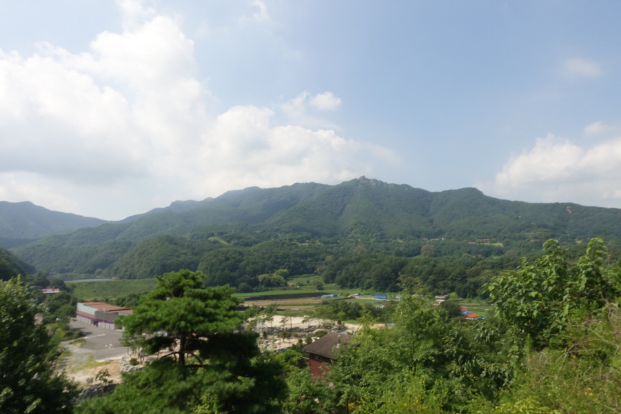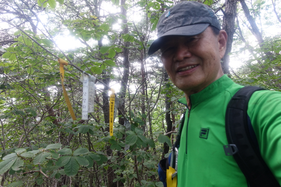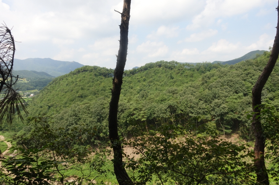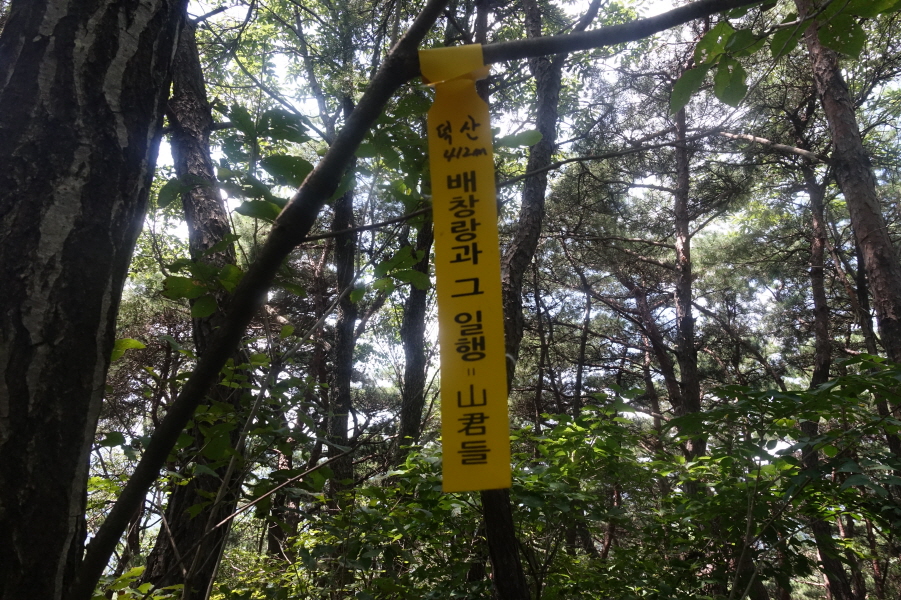우측 비포장 임도를 따라 계곡쪽으로 우회하여 덕산을 오른는 것이 결과적으로 좋은 데 과수원 주택뒤 밭길을 지나 묘지길로 들어서 고개마루에서 우측으로 급경사 능선을 지그재그 힘들게 오른다.거의 90도의 사면을 더위에 치고 오르기가 쉽지 않다.(12;07) 어렵게 능선에 붙어 좌향 완만하게 오른다.펑퍼짐 능선 끝부분이 (12;13) 덕산(412m) 정상이다.[0.9km][51분]