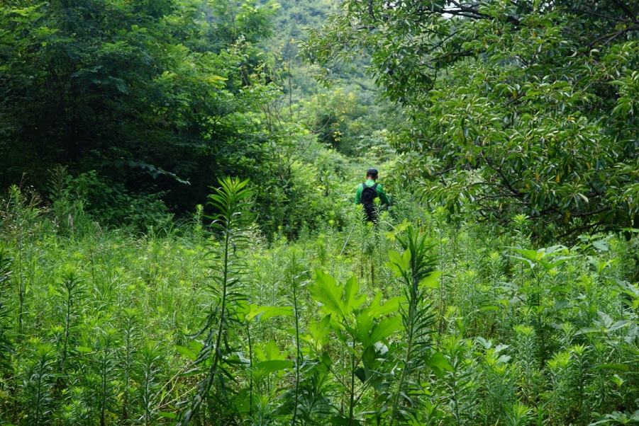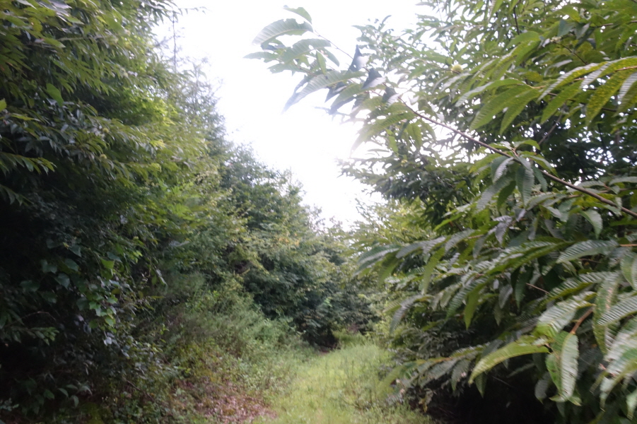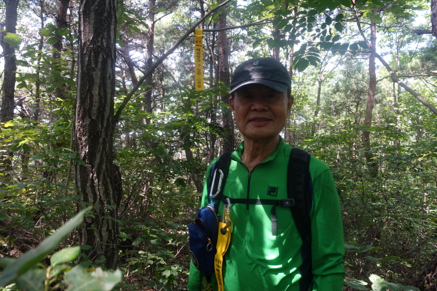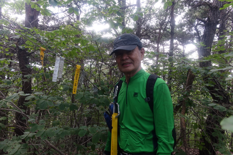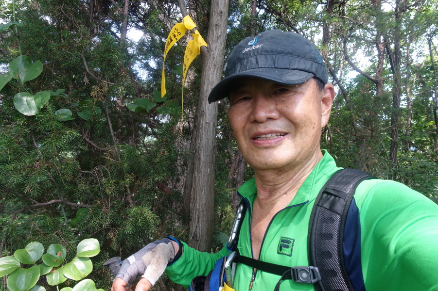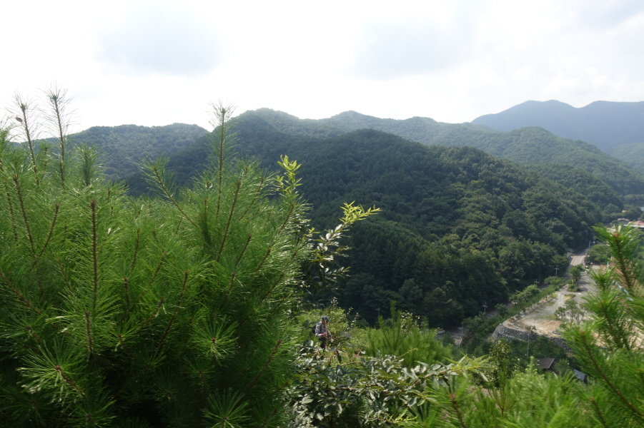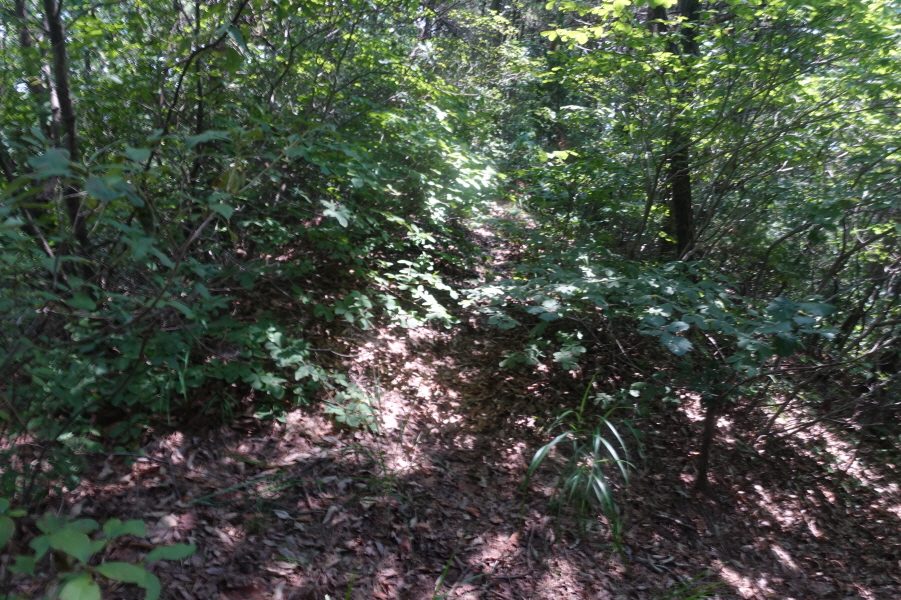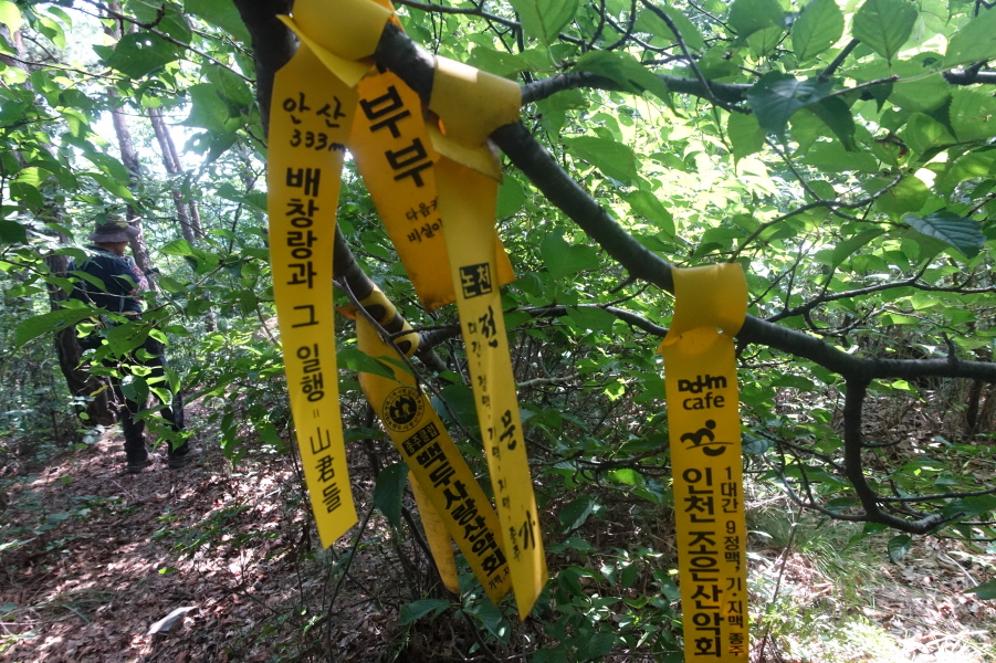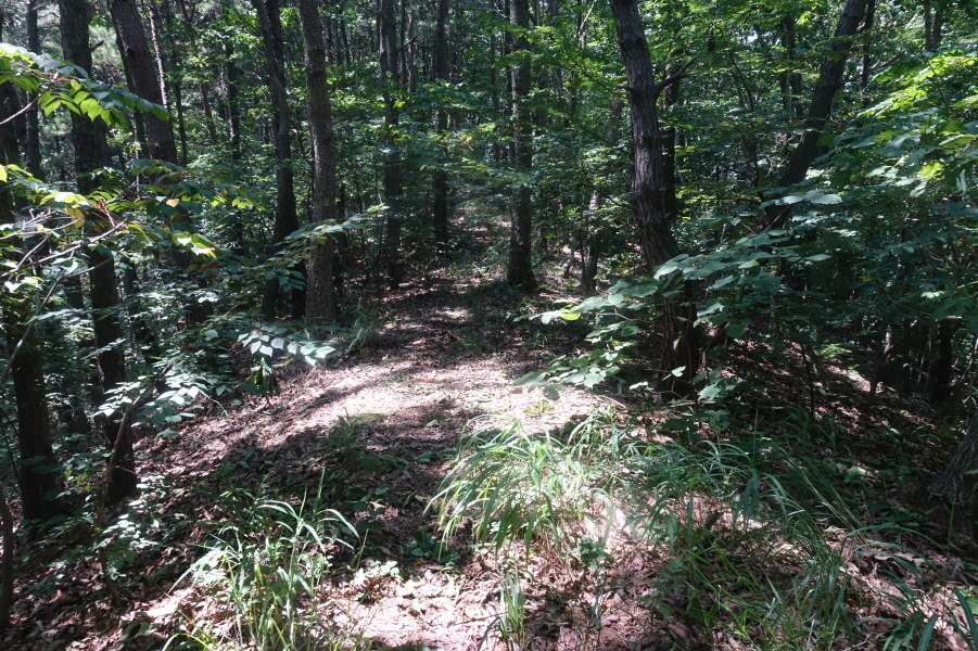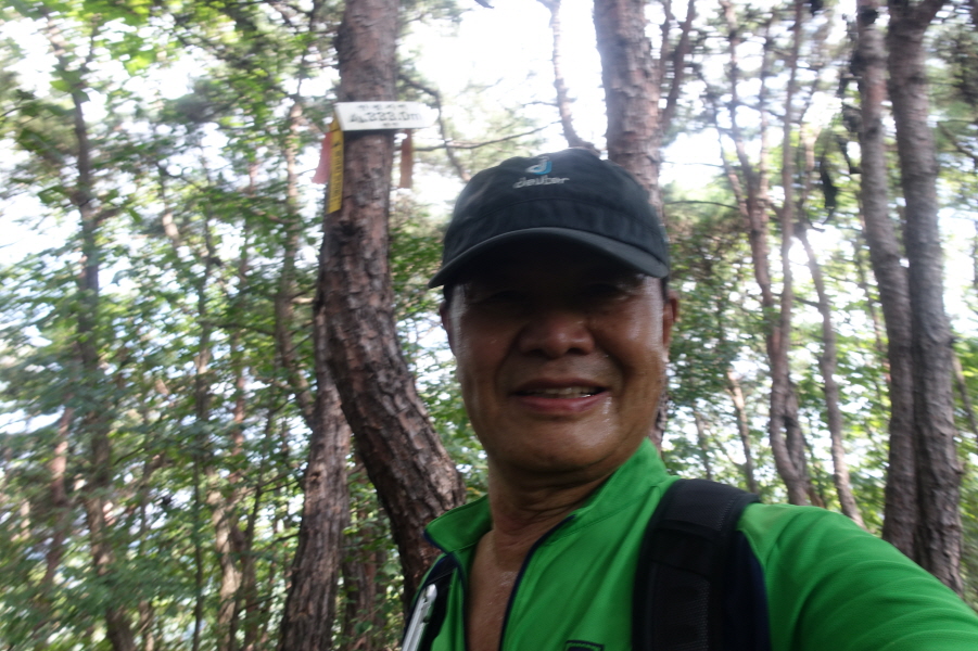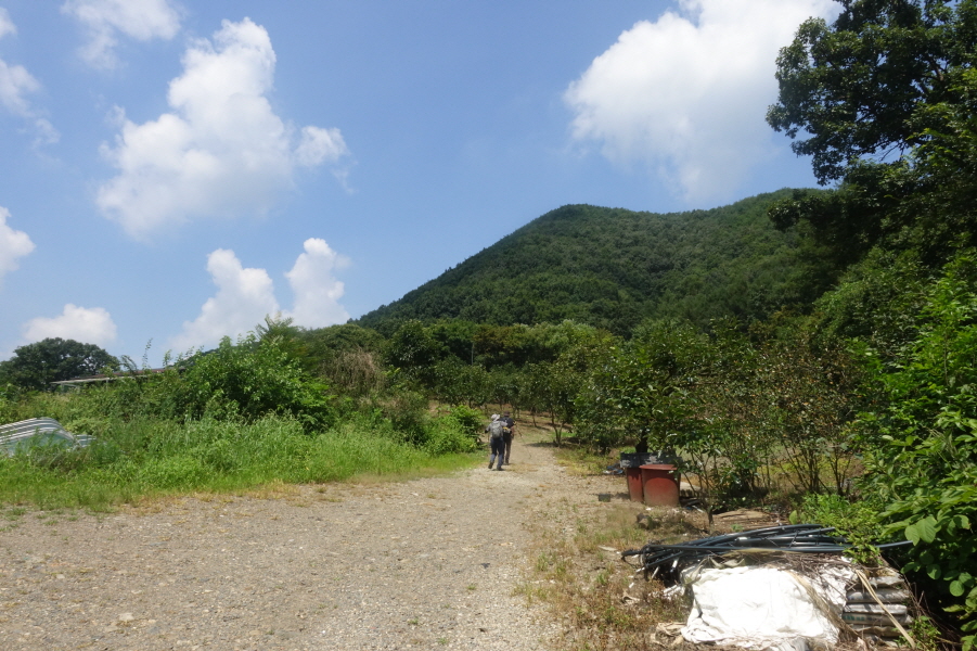 (11;22) .과수원 내주택에서 우측 비포장 임도를 따라 계곡쪽으로 우회하여 덕산을 오른는 것이 결과적으로 좋은 데 과수원 주택뒤 밭길을 지나 묘지길로 들어서 고개마루에서 우측으로 급경사 능선을 지그재그 힘들게 오릅니다.거의 90도의 사면을 더위에 치고 오르기가 쉽지 않았습니다.(0.6km/45분)
