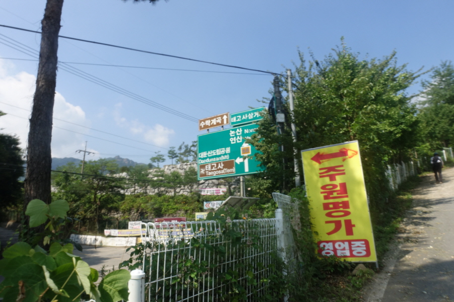 10;06 태고사삼거리 도로교통표지판(태고사/대둔산 도립공원/논산연산) 과 주원 명가 입간입니다.