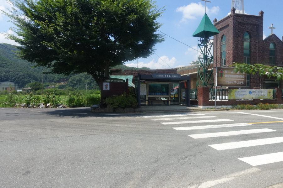 13;23 덕곡리 버스정류장과 교회건물입니다.